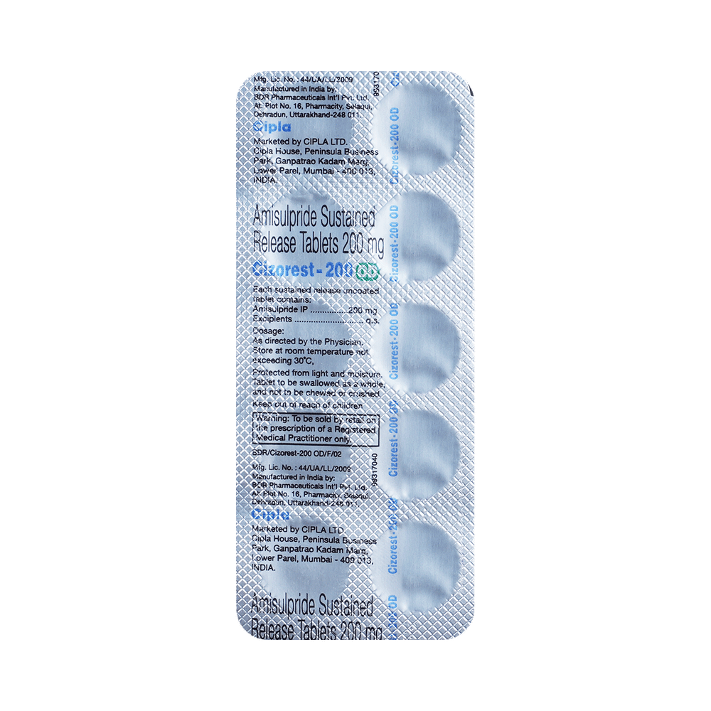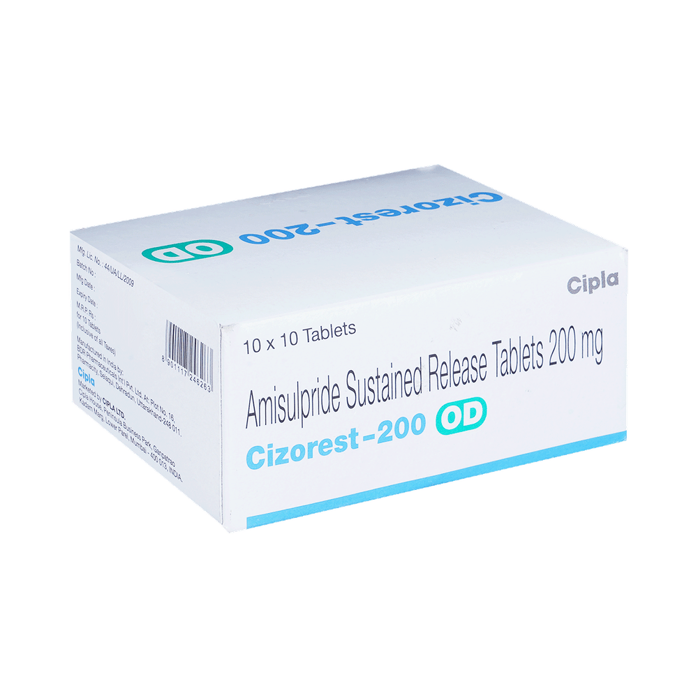 Cizorest 200 OD Tablet SR is a prescription medicine used in the treatment of schizophrenia, a mental disorder that can result in hallucinations or delusions and also adversely affects a person’s ability to think and behave. Cizorest 200 OD Tablet SR may be taken with or without food, preferably before bedtime. However, it is advised to take it at the same time each day as this helps to maintain a consistent level of medicine in the body. Take this medicine in the dose and duration as advised by your doctor and if you have missed a dose, take it as soon as you remember. Do not skip any doses and finish the full course of treatment even if you feel better. It is important that this medication is not stopped suddenly without talking to your doctor as it may worsen your symptoms.Some common side effects of this medicine include nausea, vomiting, dryness in the mouth, blurred vision, insomnia, and erectile dysfunction. Initially, this medicine may cause a sudden drop in blood pressure when you change positions, so it is better to rise slowly if you have been sitting or lying down. It also causes dizziness and sleepiness, so do not drive or do anything that requires mental focus until you know how this medicine affects you. This medicine can lead to weight gain and may increase your blood sugar and cholesterol levels. However, modifying your lifestyle by having a healthy diet and exercising regularly can reduce this side effect.