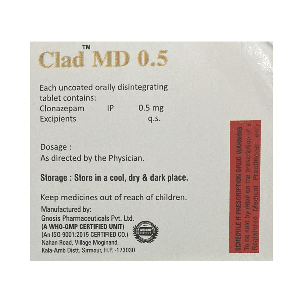Clad MD 0.5 Tablet is a prescription medicine used to treat epilepsy (seizures) and anxiety disorder. It helps to decrease the abnormal and excessive activity of the nerve cells and calms the brain. Clad MD 0.5 Tablet may be taken with or without food. However, take it at the same time each day as this helps to maintain a consistent level of medicine in the body. Take this medicine in the dose and duration as advised by your doctor as it has a high potential of habit-forming. If you have missed a dose, take it as soon as you remember it and finish the full course of treatment even if you feel better. You should not stop this medicine suddenly without talking to your doctor as it may increase the seizure frequency and can cause nausea, anxiety, flu-like symptoms, and muscle pain.Some common side effects of this medicine include fatigue, depression and impaired coordination. It may also cause dizziness and sleepiness, so do not drive or do anything that requires mental focus until you know how this medicine affects you. It is important to inform your doctor if you develop any unusual changes in mood or depression as this medicine may cause suicidal thoughts.