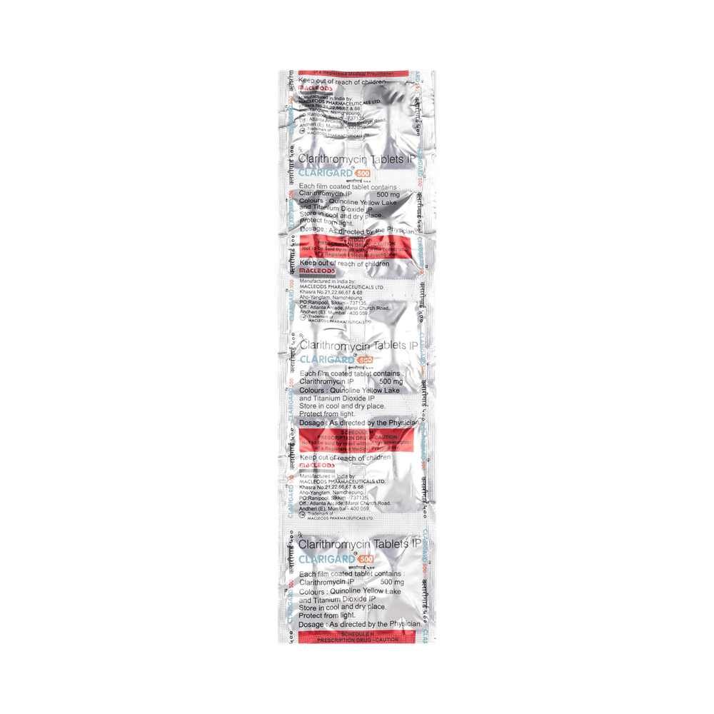 Clarigard 500 Tablet is an antibiotic used to treat various types of infections. It is effective in most infections of the respiratory tract, ear, nose, throat, lungs, and skin. It is also effective against a bacteria known as H. pylori, which is associated with peptic ulcer disease. Clarigard 500 Tablet is also effective against some infections (e.g., MAC or Mycobacterium avium complex) seen in people with reduced immunity. It stops the bacteria from growing, which helps to resolve your symptoms and cure your infection. This medicine is taken orally, preferably either one hour before or 2 hours after a meal. No antacids should be taken within 2 hours of taking this medicine. It should be used regularly at evenly spaced time intervals as prescribed by your doctor. Do not skip any doses and finish the full course of treatment even if you feel better. Stopping the medicine too early may lead to the infection returning or worsening.Common side effects with this medicine include diarrhea, nausea, indigestion, abdominal pain, headache, vomiting, and rash. These are usually temporary and subside with the completion of treatment. Consult your doctor if you find these side effects do not resolve or persist for a longer duration.Inform your doctor if you have any previous history of allergy or heart problems before taking this medicine. Pregnant or breastfeeding women should consult their doctor before using this medicine.