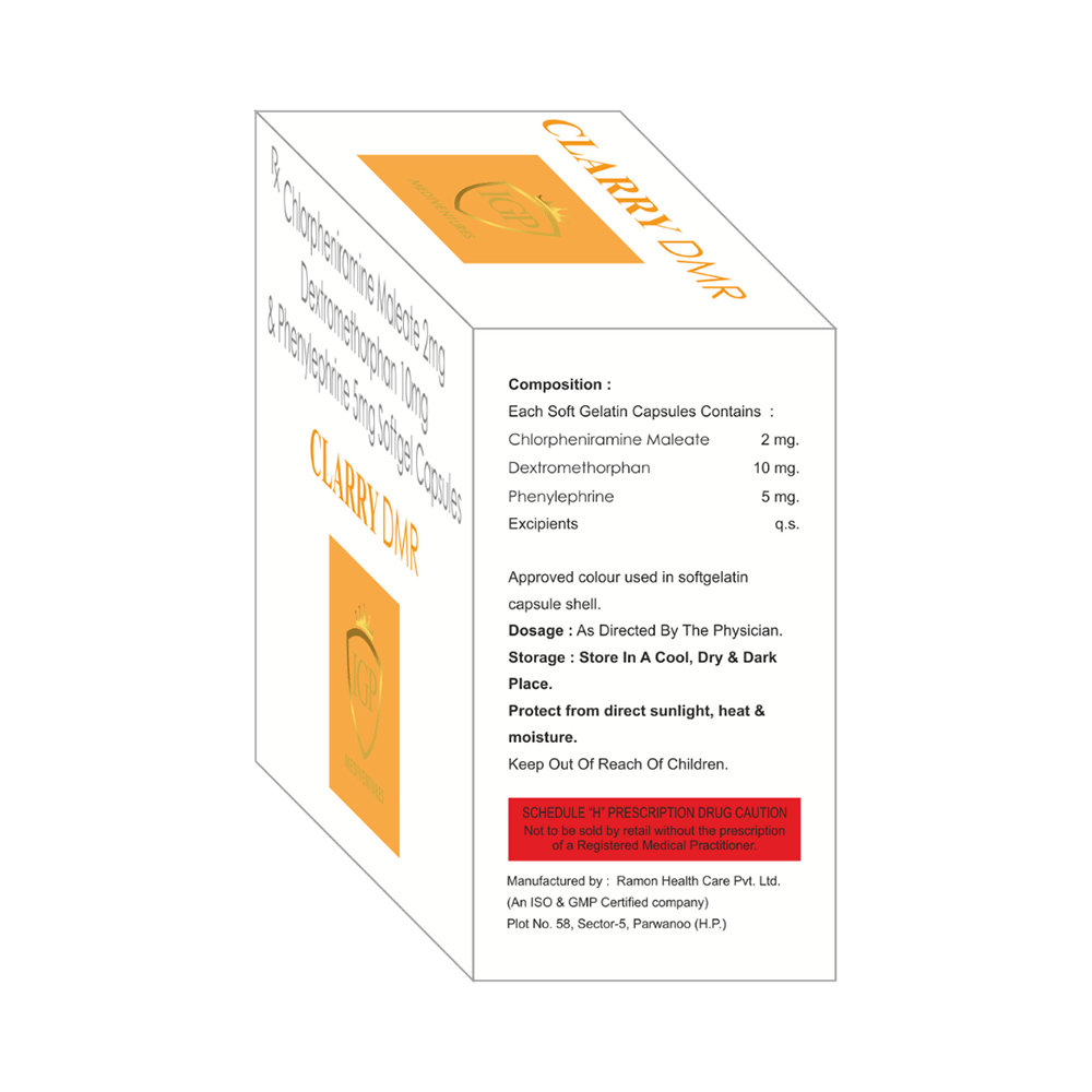 Clarry DMR Softgel Capsule is a medicine used in the treatment of common cold and cough. It can provide quick relief from cough and common cold symptoms like runny nose, stuffy nose, sneezing, watery eyes, and congestion or stuffiness. Clarry DMR Softgel Capsule is taken with or without food in a dose and duration as advised by the doctor. The dose you are given will depend on your condition and how you respond to the medicine. You should keep taking this medicine for as long as your doctor recommends. If you stop treatment too early your symptoms may come back and your condition may worsen. Let your healthcare team know about all other medications you are taking as some may affect, or be affected by this medicine.Common side effects of this medicine include headache, sedation, double vision, vomiting, diarrhea, dry mouth, and nausea. Most of these are temporary and usually resolve with time. Contact your doctor straight away if you are at all concerned about any of these side effects. This medicine can also cause sleepiness, so do not drive or do anything that requires mental focus until you know how this medicine affects you. Avoid drinking alcohol while taking this medicine as it can worsen your sleepiness.Never support self-medication or recommend your medicine to another person. It is beneficial to have plenty of fluids while taking this medication. Before taking this medicine, you should tell your doctor if you are pregnant, planning pregnancy or breastfeeding. You should also tell your doctor if you have any kidney or liver diseases so that your doctor can prescribe a suitable dose for you.