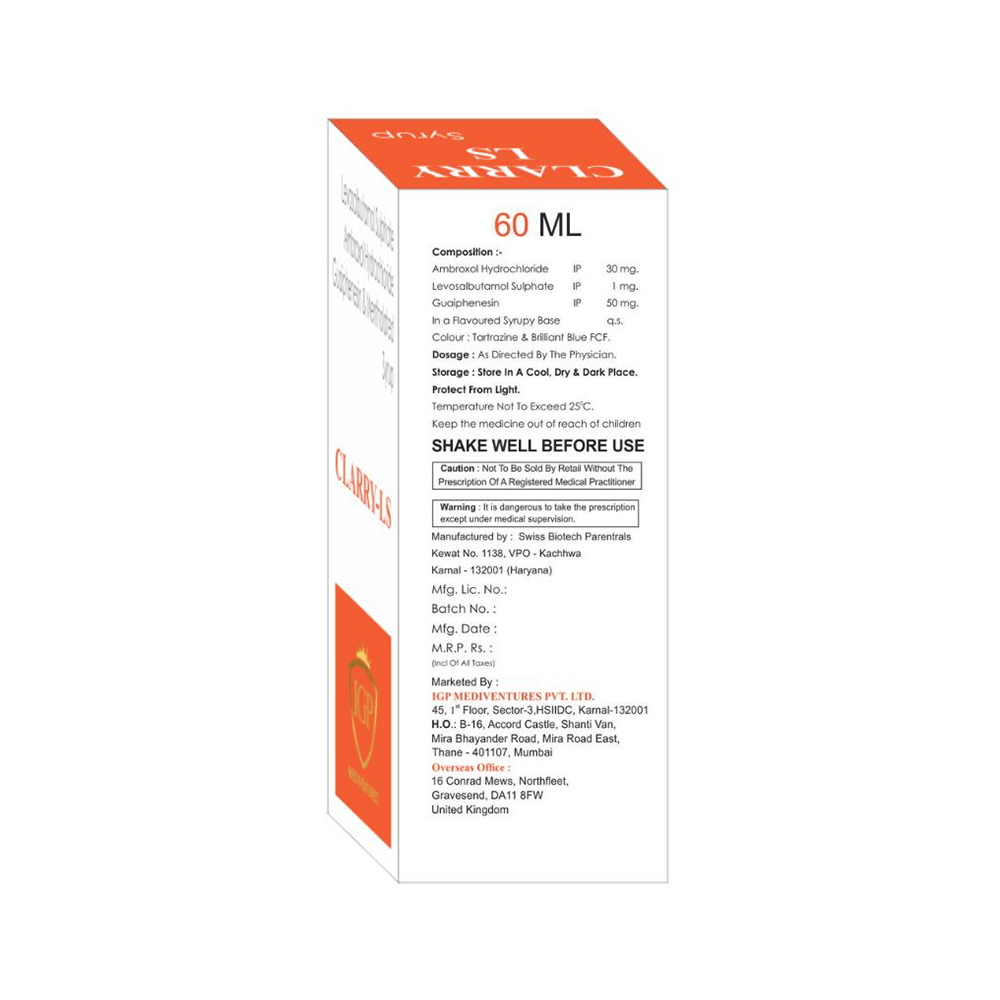 Clarry LS Syrup is a combination of four medicines. Levosalbutamol is a bronchodilator. It works by relaxing the muscles in the airways and widens airways. This makes breathing easier. Ambroxol is a mucolytic medication. It thins and loosens mucus (phlegm) in the nose, windpipe and lungs making it easier to cough out and breathing. Guaifenesin is an expectorant which decreases the stickiness of mucus (phlegm) and further helps in its removal from the airways. Menthol is an extract from peppermint that produces a sensation of coolness and relieves minor throat irritation.