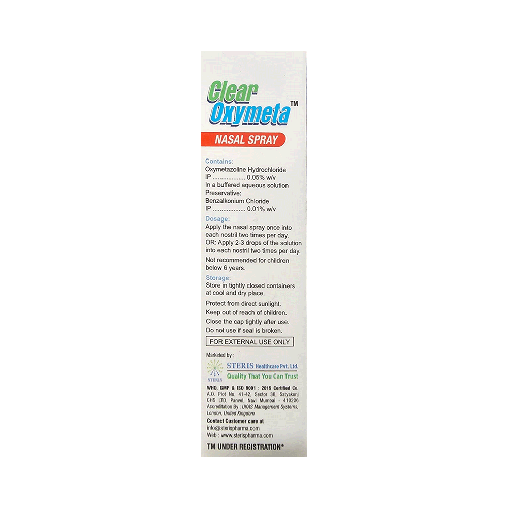 Clearoxymeta Nasal Spray is a medicine used to treat nasal congestion (blocked nose) caused by the common cold or flu, hay fever and other allergies. It narrows the blood vessels in your nose to relieve nasal congestion and blockage. Clearoxymeta Nasal Spray should be used as you have been advised by your doctor. Normally you should blow your nose gently before using it, keep one nostril closed while applying the medicine into the other, and then sniff hard to make sure it reaches deep into the nose. Then repeat the same for the other nostril. It provides relief very quickly and can last for several hours. It provides only temporary relief but do not use it more often or for longer than recommended. If you use this medicine too often or for too long, it may worsen your symptoms rather than improve them.The most common side effects are nose irritation and dryness of the mouth or throat. These are usually mild but if they bother you or do not go away, your doctor may be able to suggest ways of preventing or reducing them.It is generally a safe medicine but, before taking it, talk to your doctor about any health problems you have such as heart problems or high blood pressure (hypertension) or overactive thyroid gland or glaucoma (increased pressure in the eye), or prostate enlargement. Let your doctor know about any other medicines you are taking to make sure you are safe. Ask your doctor for advice before using this medicine if you are pregnant or breastfeeding.