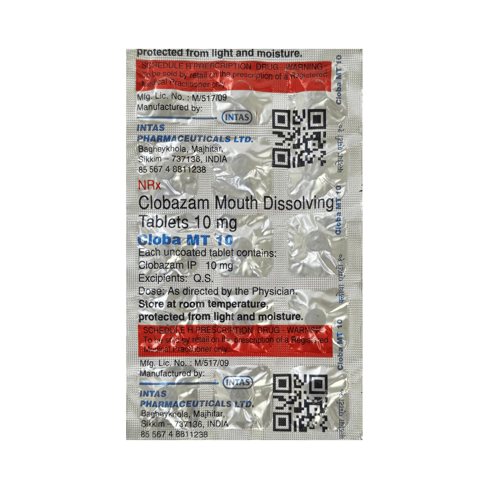 Cloba MT 10mg Tablet belongs to a class of medicines known as benzodiazepines. It is used to treat epilepsy (seizures) and severe anxiety. It works by suppressing the abnormal and excessive activity of the nerve cells in the brain. Cloba MT 10mg Tablet may be taken with or without food. However, it is advised to take it at the same time each day as this helps to maintain a consistent level of medicine in the body. Take this medicine in the dose and duration as advised by your doctor as it has a high potential of habit-forming.If you have missed a dose, take it as soon as you remember and finish the full course of treatment even if you feel better. It is important that this medication is not stopped suddenly without talking to your doctor as it may increase seizure frequency.Some common side effects of this medicine include tiredness, slurred speech, fever, cough, drooling, constipation, and difficulty in passing urine. It may cause dizziness and sleepiness, so do not drive or do anything that requires mental focus until you know how this medicine affects you. It is important to consult the doctor if you notice blisters on the skin or inside your mouth. If you have been taking this medicine for a long time then regular monitoring of blood and liver functions may be required.