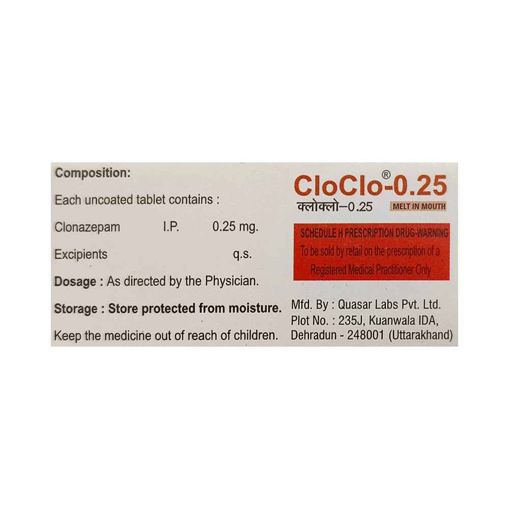 In Treatment of Anxiety disorderCloclo 0.25 Melt in Mouth Tablet stops your brain from releasing the chemicals that make you feel anxious so it can reduce the symptoms of excessive anxiety and worry. It can also reduce feelings of restlessness, tiredness, difficulty concentrating, feeling irritable and sleep problems that often come with Anxiety Disorder. It will therefore help you go about your daily activities more easily and be more productive. Keep taking this medicine even if you feel well. Stopping suddenly can cause serious problems.In Treatment of Epilepsy/SeizuresCloclo 0.25 Melt in Mouth Tablet slows down electrical signals in the brain which cause seizures (fits). It can also help reduce symptoms such as confusion, uncontrollable jerking movements, loss of awareness, and fear or anxiety. The medicine can allow you to do some activities that you would otherwise be forbidden or scared to do (such as swimming and driving). It can take a few weeks for this medicine to work (because the dose has to be increased slowly) and during this time you may still have seizures. Do not stop using this medicine even if you feel well, until your doctor advises you to. Missing doses may trigger a seizure.show moreshow less