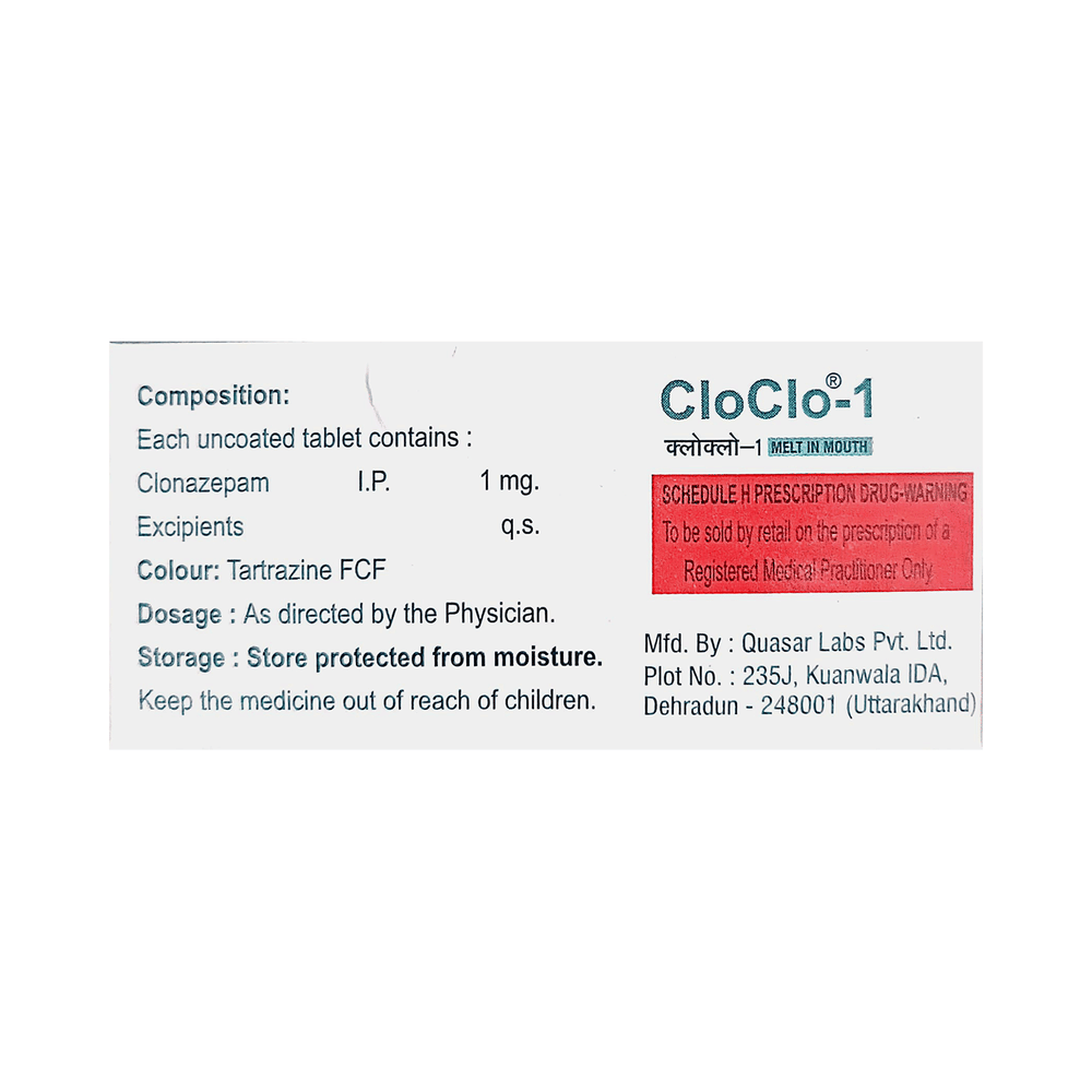 Cloclo 1 Tablet is a prescription medicine used to treat epilepsy (seizures) and anxiety disorder. It helps to decrease the abnormal and excessive activity of the nerve cells and calms the brain. Cloclo 1 Tablet may be taken with or without food. However, take it at the same time each day as this helps to maintain a consistent level of medicine in the body. Take this medicine in the dose and duration as advised by your doctor as it has a high potential of habit-forming. If you have missed a dose, take it as soon as you remember it and finish the full course of treatment even if you feel better. You should not stop this medicine suddenly without talking to your doctor as it may increase the seizure frequency and can cause nausea, anxiety, flu-like symptoms, and muscle pain.Some common side effects of this medicine include fatigue, depression and impaired coordination. It may also cause dizziness and sleepiness, so do not drive or do anything that requires mental focus until you know how this medicine affects you. It is important to inform your doctor if you develop any unusual changes in mood or depression as this medicine may cause suicidal thoughts.