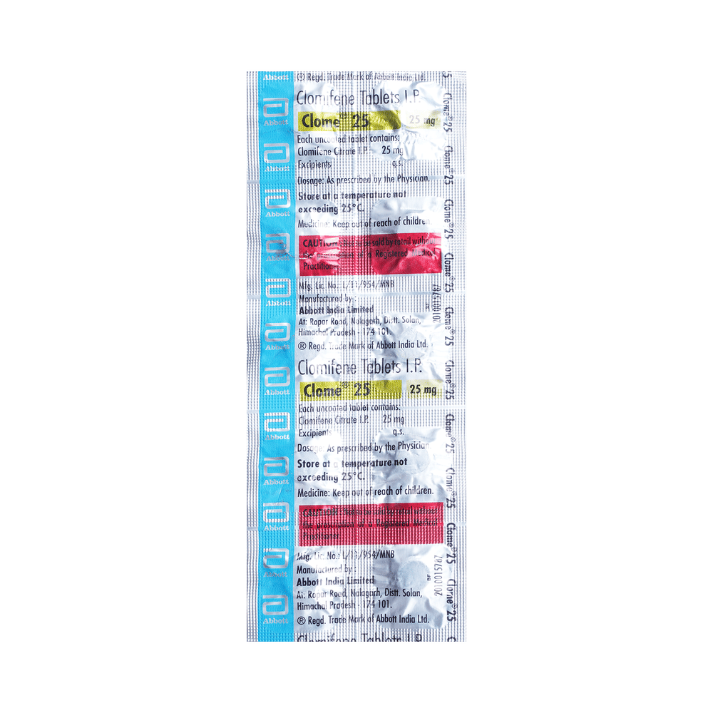 Clome 25mg Tablet is a medicine used to treat male and female infertility. In males, it stimulates hormone production, leading to increased sperm production and improved fertility. Additionally, it may help women who are unable to become pregnant, due to ovulation problems or polycystic ovary syndrome (PCOS). Clome 25mg Tablet may be taken with or without food. Take it regularly and at the same time every day to get the most benefit. It is important to strictly follow the prescribed schedule and dosage to maximize its benefits. The doctor may monitor regularly to track the response and adjust the dosage if necessary.The most common side effects of this medicine include headache, nausea, vomiting, dizziness, breast enlargement in male, breast pain, hot flushes, enlargement of ovaries, and gastrointestinal disturbances. If you experience any of these side effects that do not go away or get worse, let your doctor know. They may be able to help by adjusting the dosage or by prescribing you an alternate medicine.Clome 25mg Tablet may not be suitable for individuals with certain medical conditions, such as liver disease, hormonal imbalances, abnormal uterine bleeding, or ovarian cysts. Pregnant women should avoid using this medicine, as it may cause potential harm to the developing baby. Take precautions while engaging in activities that require clear vision and mental alertness as this medicine might cause dizziness. Let your doctor also know about all the other medicines you are taking to make sure it is safe for you.
