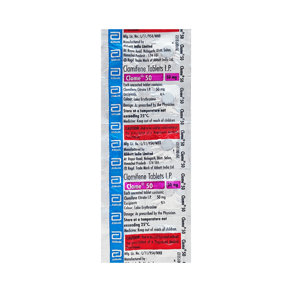 Clome 50 Tablet is a medicine used to treat female infertility. It is used in women who are unable to become pregnant, due to ovulation problems or suffering from polycystic ovary syndrome (PCOS). Take Clome 50 Tablet exactly as prescribed by the doctor. It is usually taken for a few days at the beginning of the menstrual cycle. Regular monitoring, including ultrasound scans or hormone level tests, may be needed to track ovulation. Maintaining a healthy lifestyle, including a balanced diet and regular exercise, can further improve the chances of pregnancy while on this medication.The most common side effects associated with this medicine are hot flushes (red and warm face), stomach discomfort, breast pain, and visual disturbances. Most of these symptoms are temporary. However, if they persist, consult your doctor as soon as possible.Inform your doctor before taking Clome 50 Tablet if you have any issues with the liver, kidney, or heart, and if you are pregnant. Additionally, tell your doctor if you are taking any medicine or supplement before starting Clome 50 Tablet.