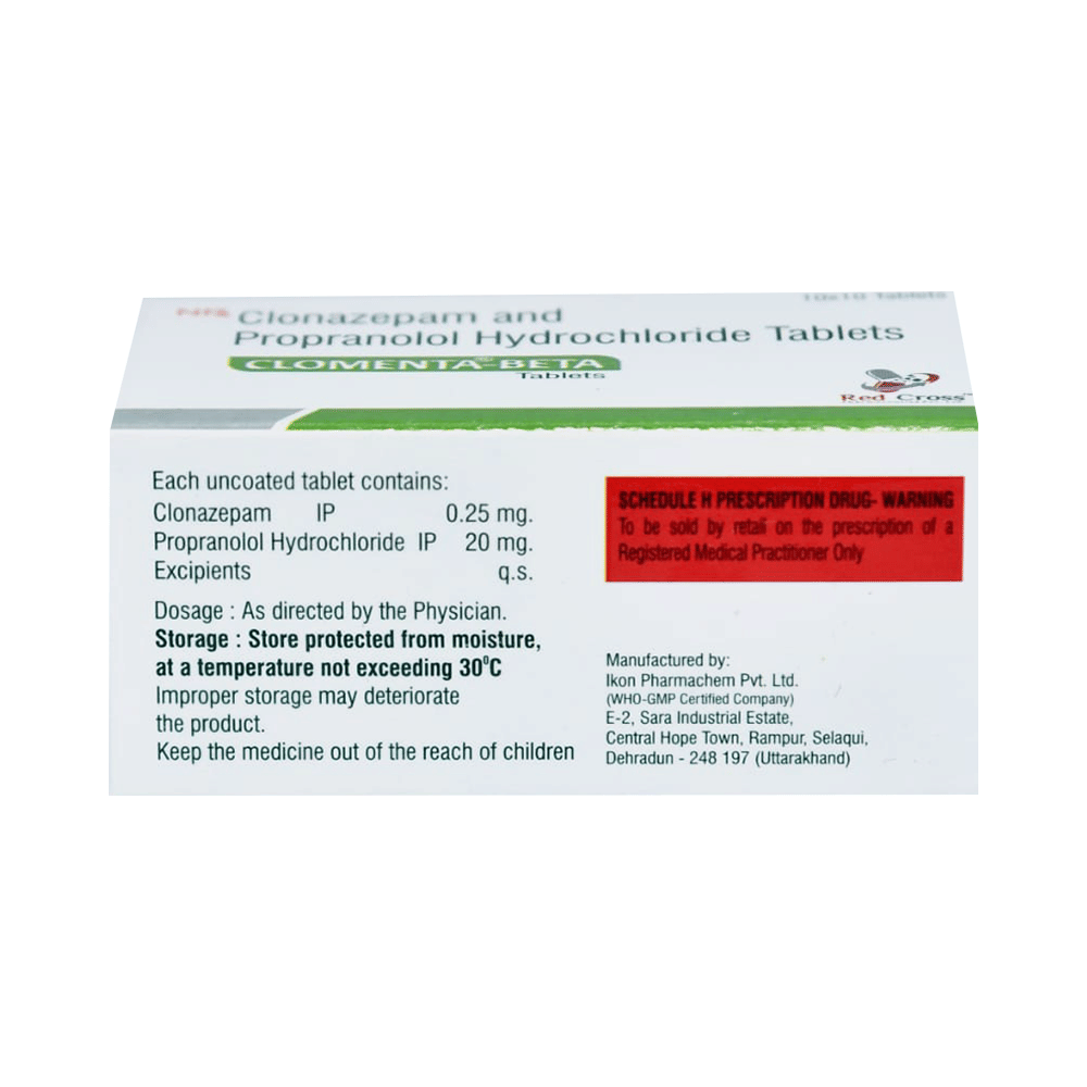 Clomenta-Beta Tablet is a prescription medicine used to treat anxiety disorder. It calms the brain by decreasing the abnormal and excessive activity of the nerve cells. It blocks the action of certain chemical messengers on the heart and blood vessels. This reduces heart rate and blood pressure. Clomenta-Beta Tablet should be taken on an empty stomach. However, it is advised to take it at the same time each day as this helps to maintain a consistent level of medicine in the body. Take this medicine in the dose and duration advised by your doctor as it has high habit-forming potential. If you miss a dose of this medicine, take it as soon as you remember. Finish the full course of treatment even if you feel better. It is important not to stop taking this medicine suddenly as it may cause withdrawal symptoms. Avoid consuming alcohol while taking this medicine as this may reduce its effectiveness.Some common side effects of this medicine include confusion, memory impairment, slow heart rate, tiredness, and nightmare. It may also cause dizziness and sleepiness. So, do not drive or do anything that requires mental focus until you know how this medicine affects you. It is important to inform your doctor if you develop any unusual changes in mood or depression as this medicine may cause suicidal thoughts.Take caution while taking medicine if you are suffering from liver disease. Your doctor should also know about all other medicines you are taking as many of these may make this medicine less effective or change the way it works. Inform your doctor if you are pregnant, planning pregnancy, or breastfeeding.