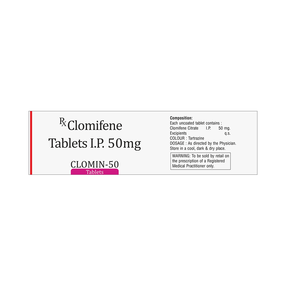 Clomin 50 Tablet is a medicine used to treat female infertility. It is used in women who are unable to become pregnant, due to ovulation problems or suffering from polycystic ovary syndrome (PCOS). Take Clomin 50 Tablet exactly as prescribed by the doctor. It is usually taken for a few days at the beginning of the menstrual cycle. Regular monitoring, including ultrasound scans or hormone level tests, may be needed to track ovulation. Maintaining a healthy lifestyle, including a balanced diet and regular exercise, can further improve the chances of pregnancy while on this medication.The most common side effects associated with this medicine are hot flushes (red and warm face), stomach discomfort, breast pain, and visual disturbances. Most of these symptoms are temporary. However, if they persist, consult your doctor as soon as possible.Inform your doctor before taking Clomin 50 Tablet if you have any issues with the liver, kidney, or heart, and if you are pregnant. Additionally, tell your doctor if you are taking any medicine or supplement before starting Clomin 50 Tablet.