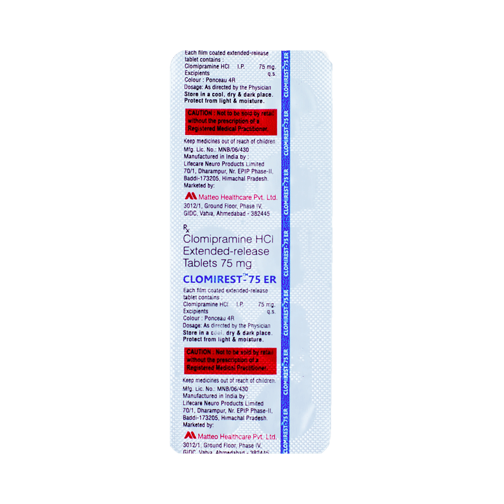 Clomirest 75 ER Tablet is a medicine used in the treatment of obsessive compulsive disorders (OCD), phobic states (such as intense fears that interfere with daily life), and depression. It works by increasing the levels of serotonin, a natural chemical in the brain that affects mood and behavior. Take Clomirest 75 ER Tablet exactly as prescribed by your doctor. The dose is usually started low and increased gradually to reduce side effects. It may take a few weeks before you notice the full benefits, so it is important not to stop taking it suddenly, even if you feel better. For best results, take the medicine at the same time every day and try not to miss any doses.Common side effects of Clomirest 75 ER Tablet include dry mouth, constipation, dizziness, drowsiness, blurred vision, increased sweating, and changes in appetite or weight. These are often mild and may improve as your body gets used to the medicine. If you feel very drowsy, avoid driving or operating heavy machinery. If any of these side effects persist or worsen, inform your doctor promptly.Clomirest 75 ER Tablet should be used with caution in people with heart disease, seizure disorders, glaucoma, or difficulty passing urine. This medicine can increase the risk of suicidal thoughts in some people, especially young adults; therefore, close monitoring at the start of treatment is important.Clomirest 75 ER Tablet should not be taken together with medicines called monoamine oxidase inhibitors (MAOIs), or within two weeks of stopping them, due to the risk of serious reactions. Alcohol should be avoided as it can worsen drowsiness and other side effects. Pregnant and breastfeeding women should consult their doctors before taking this medicine to make sure it is safe.