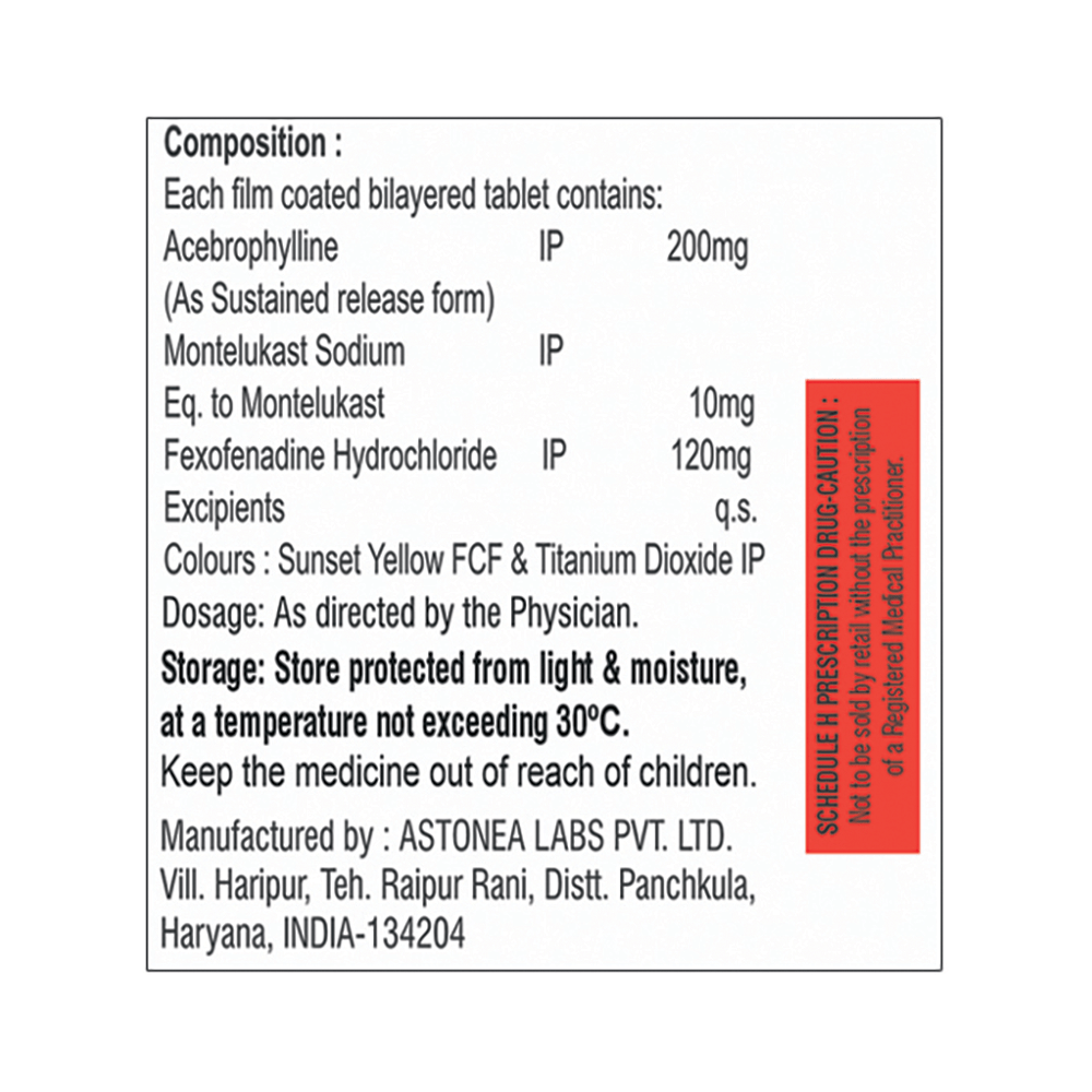Salt Composition: Montelukast (10mg) + Fexofenadine (120mg) + Acebrophylline (200mg)