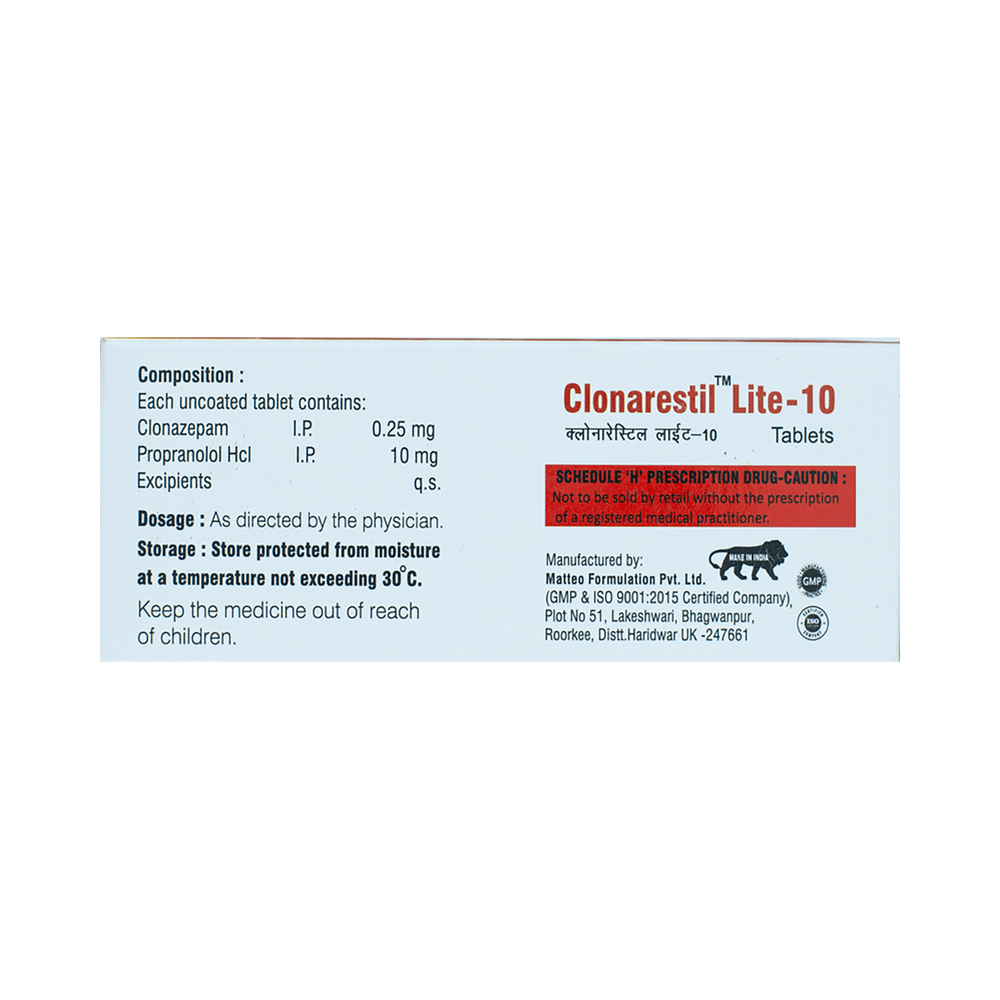 Clonarestil Lite 10 Tablet is a prescription medicine used to treat anxiety disorder. It calms the brain by decreasing the abnormal and excessive activity of the nerve cells. It blocks the action of certain chemical messengers on the heart and blood vessels. This reduces heart rate and blood pressure. Clonarestil Lite 10 Tablet should be taken on an empty stomach. However, it is advised to take it at the same time each day as this helps to maintain a consistent level of medicine in the body. Take this medicine in the dose and duration advised by your doctor as it has high habit-forming potential. If you miss a dose of this medicine, take it as soon as you remember. Finish the full course of treatment even if you feel better. It is important not to stop taking this medicine suddenly as it may cause withdrawal symptoms. Avoid consuming alcohol while taking this medicine as this may reduce its effectiveness.Some common side effects of this medicine include confusion, memory impairment, slow heart rate, tiredness, and nightmare. It may also cause dizziness and sleepiness. So, do not drive or do anything that requires mental focus until you know how this medicine affects you. It is important to inform your doctor if you develop any unusual changes in mood or depression as this medicine may cause suicidal thoughts.Take caution while taking medicine if you are suffering from liver disease. Your doctor should also know about all other medicines you are taking as many of these may make this medicine less effective or change the way it works. Inform your doctor if you are pregnant, planning pregnancy, or breastfeeding.