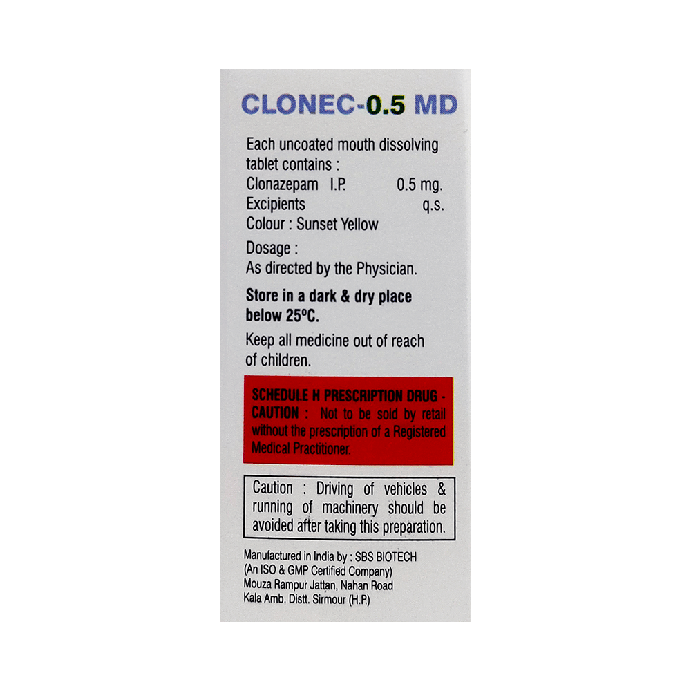 Clonec 0.5 MD Tablet is a prescription medicine used to treat epilepsy (seizures) and anxiety disorder. It helps to decrease the abnormal and excessive activity of the nerve cells and calms the brain. Clonec 0.5 MD Tablet may be taken with or without food. However, take it at the same time each day as this helps to maintain a consistent level of medicine in the body. Take this medicine in the dose and duration as advised by your doctor as it has a high potential of habit-forming. If you have missed a dose, take it as soon as you remember it and finish the full course of treatment even if you feel better. You should not stop this medicine suddenly without talking to your doctor as it may increase the seizure frequency and can cause nausea, anxiety, flu-like symptoms, and muscle pain.Some common side effects of this medicine include fatigue, depression and impaired coordination. It may also cause dizziness and sleepiness, so do not drive or do anything that requires mental focus until you know how this medicine affects you. It is important to inform your doctor if you develop any unusual changes in mood or depression as this medicine may cause suicidal thoughts.