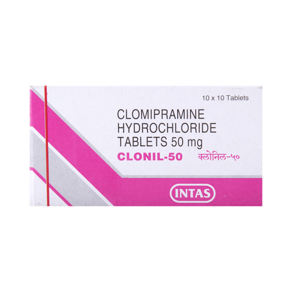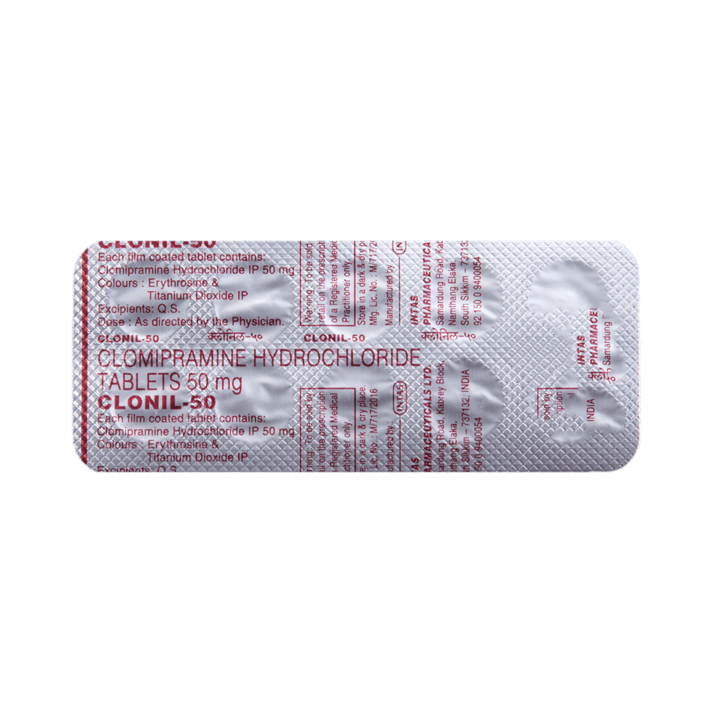 CLOnil 50 Tablet is a medicine used in the treatment of obsessive compulsive disorders (OCD), phobic states (such as intense fears that interfere with daily life), and depression. It works by increasing the levels of serotonin, a natural chemical in the brain that affects mood and behavior. Take CLOnil 50 Tablet exactly as prescribed by your doctor. The dose is usually started low and increased gradually to reduce side effects. It may take a few weeks before you notice the full benefits, so it is important not to stop taking it suddenly, even if you feel better. For best results, take the medicine at the same time every day and try not to miss any doses.Common side effects of CLOnil 50 Tablet include dry mouth, constipation, dizziness, drowsiness, blurred vision, increased sweating, and changes in appetite or weight. These are often mild and may improve as your body gets used to the medicine. If you feel very drowsy, avoid driving or operating heavy machinery. If any of these side effects persist or worsen, inform your doctor promptly.CLOnil 50 Tablet should be used with caution in people with heart disease, seizure disorders, glaucoma, or difficulty passing urine. This medicine can increase the risk of suicidal thoughts in some people, especially young adults; therefore, close monitoring at the start of treatment is important.CLOnil 50 Tablet should not be taken together with medicines called monoamine oxidase inhibitors (MAOIs), or within two weeks of stopping them, due to the risk of serious reactions. Alcohol should be avoided as it can worsen drowsiness and other side effects. Pregnant and breastfeeding women should consult their doctors before taking this medicine to make sure it is safe.