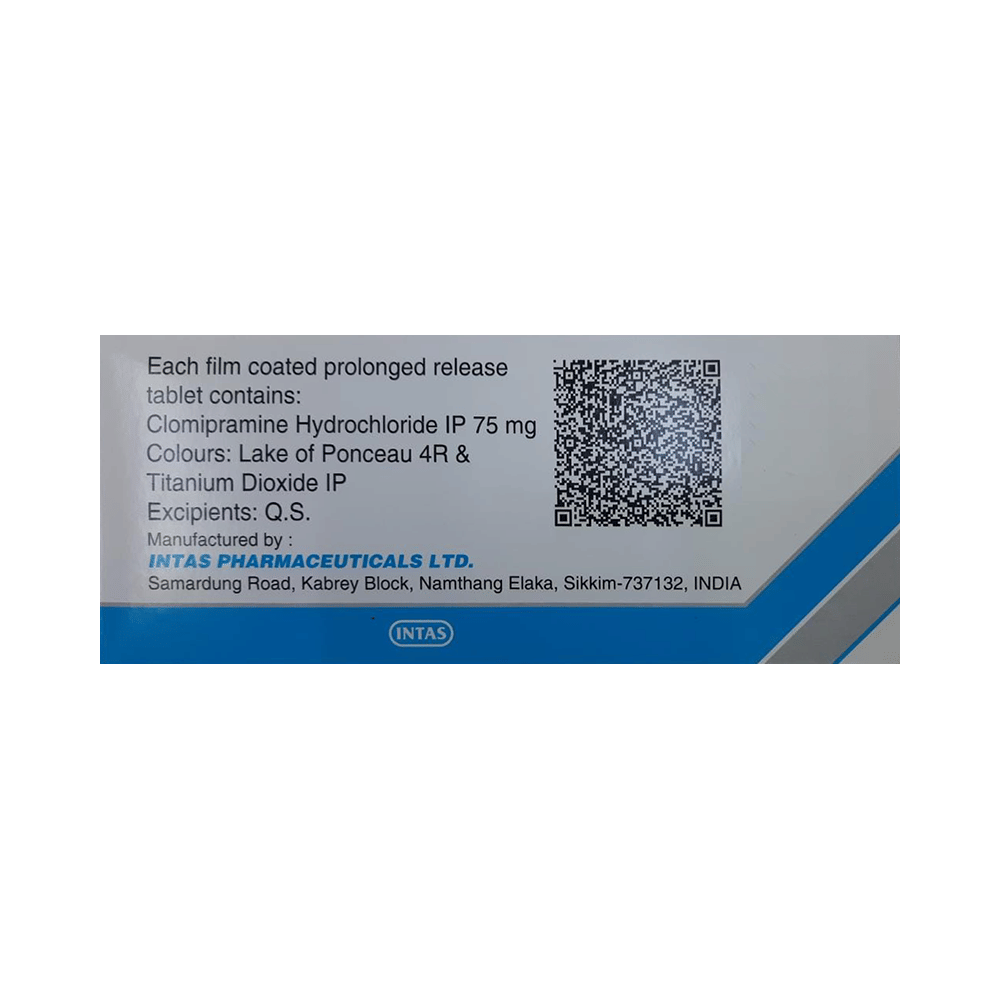 CLOnil 75 SR Tablet is a medicine used in the treatment of obsessive compulsive disorders (OCD), phobic states (such as intense fears that interfere with daily life), and depression. It works by increasing the levels of serotonin, a natural chemical in the brain that affects mood and behavior. Take CLOnil 75 SR Tablet exactly as prescribed by your doctor. The dose is usually started low and increased gradually to reduce side effects. It may take a few weeks before you notice the full benefits, so it is important not to stop taking it suddenly, even if you feel better. For best results, take the medicine at the same time every day and try not to miss any doses.Common side effects of CLOnil 75 SR Tablet include dry mouth, constipation, dizziness, drowsiness, blurred vision, increased sweating, and changes in appetite or weight. These are often mild and may improve as your body gets used to the medicine. If you feel very drowsy, avoid driving or operating heavy machinery. If any of these side effects persist or worsen, inform your doctor promptly.CLOnil 75 SR Tablet should be used with caution in people with heart disease, seizure disorders, glaucoma, or difficulty passing urine. This medicine can increase the risk of suicidal thoughts in some people, especially young adults; therefore, close monitoring at the start of treatment is important.CLOnil 75 SR Tablet should not be taken together with medicines called monoamine oxidase inhibitors (MAOIs), or within two weeks of stopping them, due to the risk of serious reactions. Alcohol should be avoided as it can worsen drowsiness and other side effects. Pregnant and breastfeeding women should consult their doctors before taking this medicine to make sure it is safe.