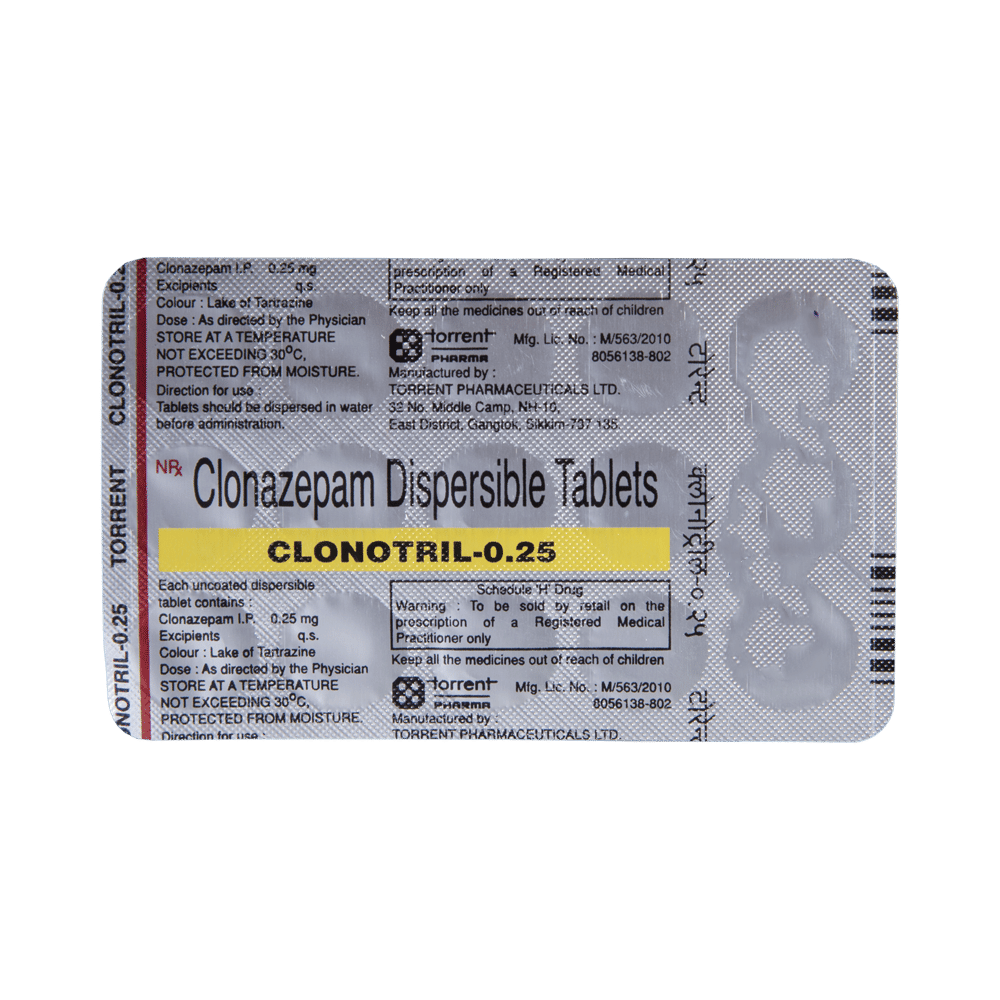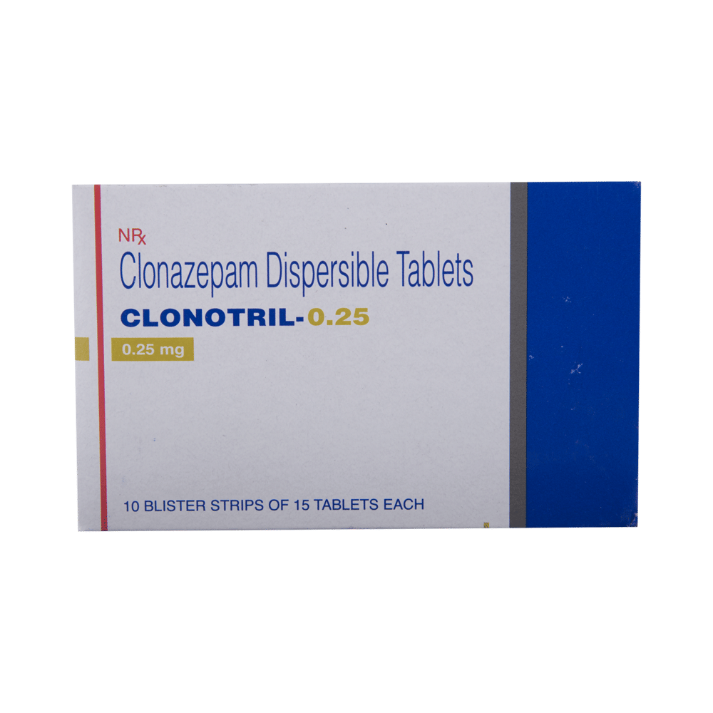 Clonotril 0.25mg Tablet DT is a prescription medicine used to treat epilepsy (seizures) and anxiety disorder. It helps to decrease the abnormal and excessive activity of the nerve cells and calms the brain. Clonotril 0.25mg Tablet DT may be taken with or without food. However, take it at the same time each day as this helps to maintain a consistent level of medicine in the body. Take this medicine in the dose and duration as advised by your doctor as it has a high potential of habit-forming. If you have missed a dose, take it as soon as you remember it and finish the full course of treatment even if you feel better. You should not stop this medicine suddenly without talking to your doctor as it may increase the seizure frequency and can cause nausea, anxiety, flu-like symptoms, and muscle pain.Some common side effects of this medicine include fatigue, depression and impaired coordination. It may also cause dizziness and sleepiness, so do not drive or do anything that requires mental focus until you know how this medicine affects you. It is important to inform your doctor if you develop any unusual changes in mood or depression as this medicine may cause suicidal thoughts.
