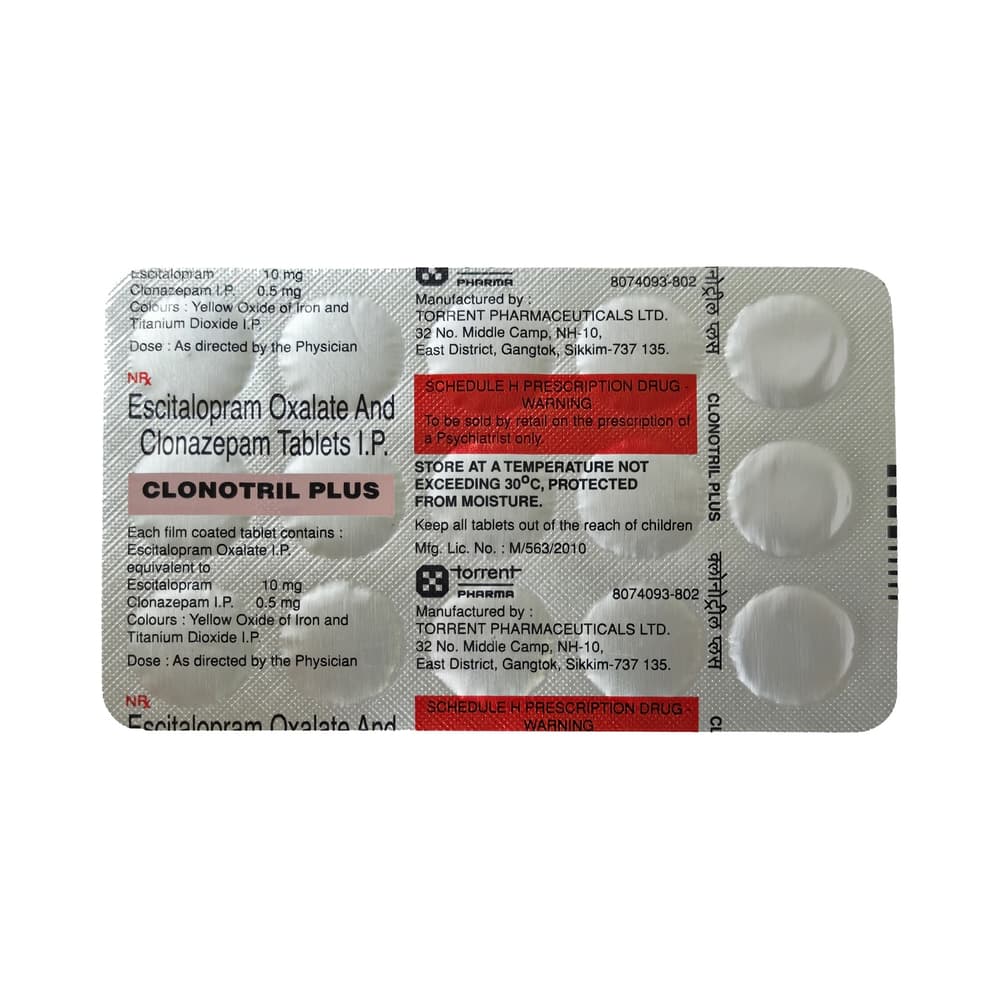 Clonotril Plus 0.5 mg/10 mg Tablet is a prescription medicine used to treat anxiety disorder. It is the combination medicine that calms the brain by decreasing the abnormal and excessive activity of the nerve cells. It also works by increasing the level of a chemical messenger in the brain which improves mood. Clonotril Plus 0.5 mg/10 mg Tablet can be taken with or without food. However, it is advised to take it at the same time each day as this helps to maintain a consistent level of medicine in the body. Take this medicine in the dose and duration advised by your doctor as it has habit-forming potential. If you miss a dose of this medicine, take it as soon as you remember. Finish the full course of treatment even if you feel better. It is important not to stop taking this medicine suddenly as it may cause withdrawal symptoms.Some common side effects of this medicine include delayed ejaculation, low sexual desire, vomiting, memory impairment, depression, and confusion. It may also cause dizziness and sleepiness. So, do not drive or do anything that requires mental focus until you know how this medicine affects you. It may cause weight gain or weight loss depending upon person to person. To prevent weight gain, you can eat a balanced diet and exercise regularly. On the other hand, weight loss can be prevented by increasing food portions in your diet. It is important to inform your doctor if you develop any unusual changes in mood as it can cause suicidal thoughts.Take caution while taking medicine if you are suffering from liver disease. Your doctor should also know about all other medicines you are taking as many of these may make this medicine less effective or change the way it works. Inform your doctor if you are pregnant, planning pregnancy or breastfeeding.
