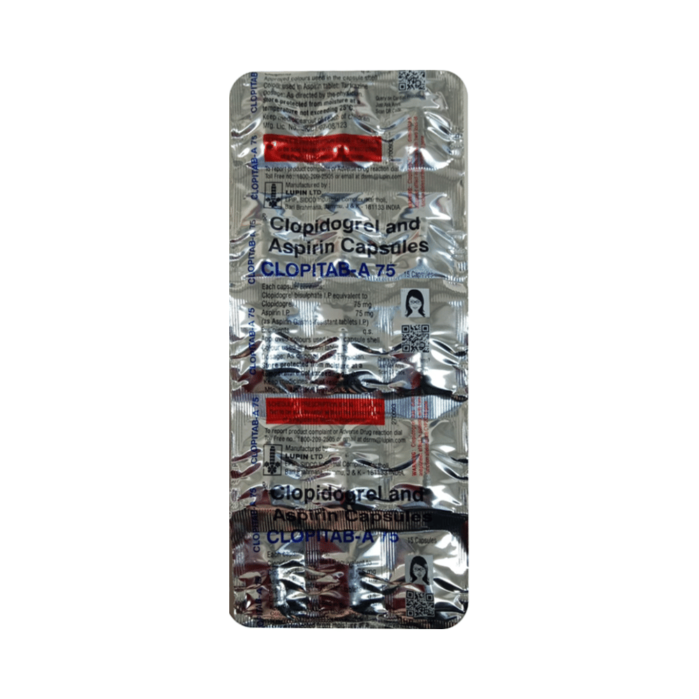 Clopitab-A 75 Capsule is a combination of two antiplatelet medicines: Aspirin and Clopidogrel which prevent heart attack. They work by preventing the platelets from sticking together and decrease the formation of harmful blood clots. It is also used to treat acute coronary syndrome (ACS).