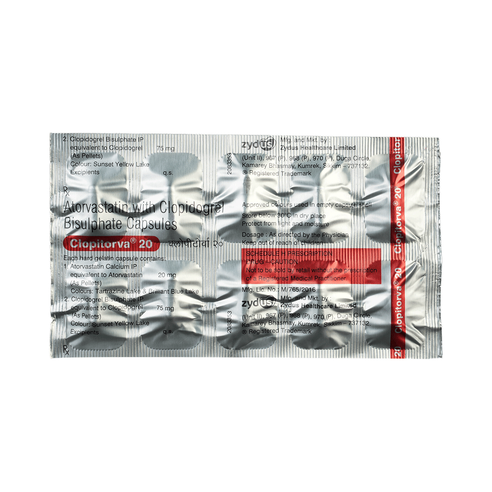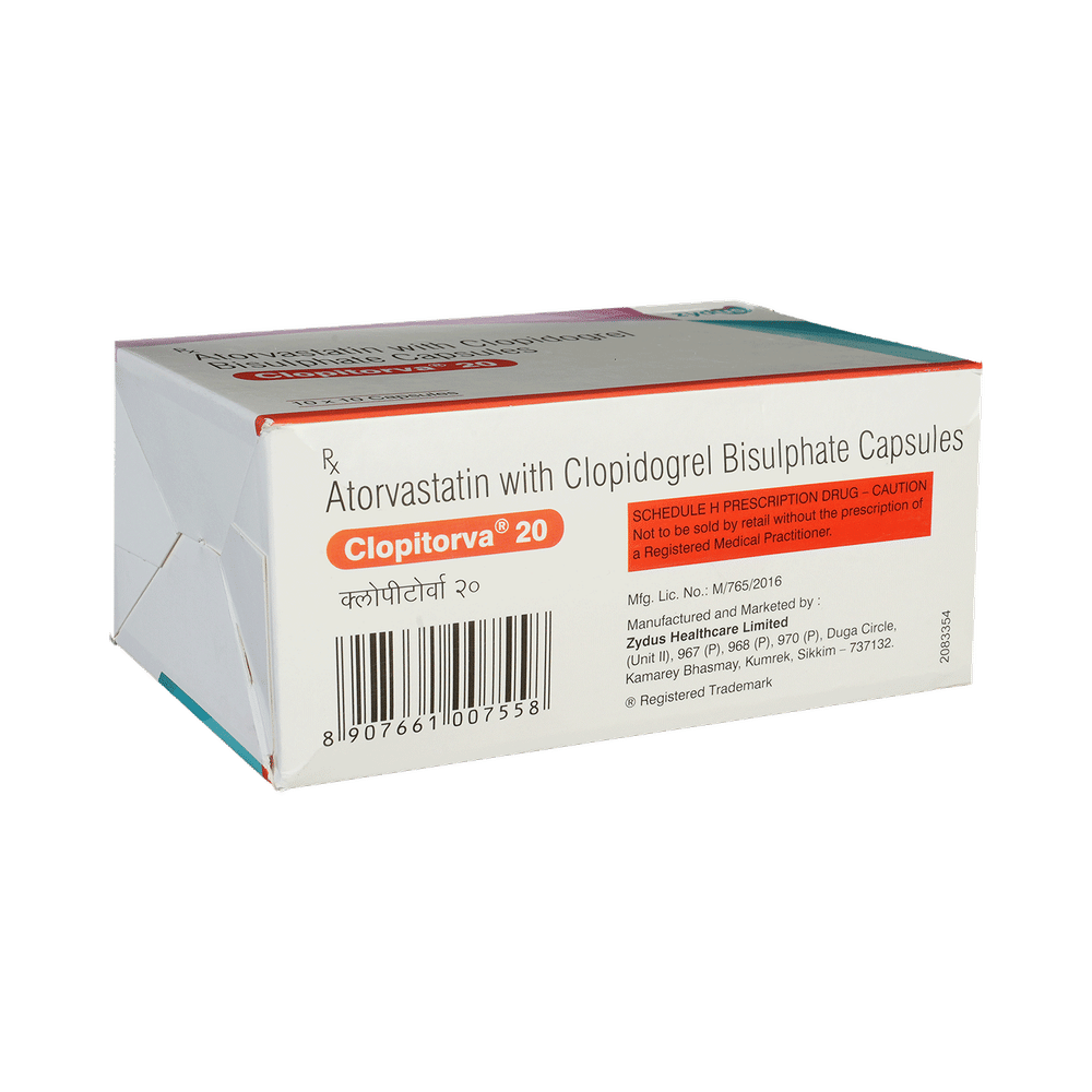 Clopitorva 20 Capsule is a combination of two medicines used to prevent heart attack and stroke. This medicine reduces the "bad" cholesterol (LDL) and triglycerides (fats) levels. Moreover, it also decreases the formation of blood clots. Clopitorva 20 Capsule should be taken with food to avoid stomach upset. You should take it regularly at evenly spaced intervals as per the schedule prescribed by your doctor. Taking it at the same time every day will help you remember to take it. The dose and duration of treatment will depend on what you are being treated for. Do not stop taking it until you have finished the complete course, even when you feel better. Lifestyle changes like low-fat diet, exercise and not smoking may help this medicine to work better.Nausea, abdominal pain, and headache are some common side effects of this medicine. This medicine increases your risk of bleeding, so it is important to be careful while shaving, cutting nails, using sharp objects, or engaging in contact sports (e.g., football, wrestling). Let your doctor know if you notice yellowing of the skin, muscle pain or dark urine.Before taking this medicine, tell your doctor if you have liver or kidney disease or you are suffering from bleeding disorder. You must tell your doctor if you are pregnant, planning pregnancy or breastfeeding. You should also let your healthcare team know all other medicines you are taking as they may affect, or be affected by this medicine.