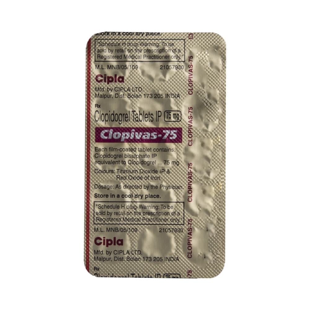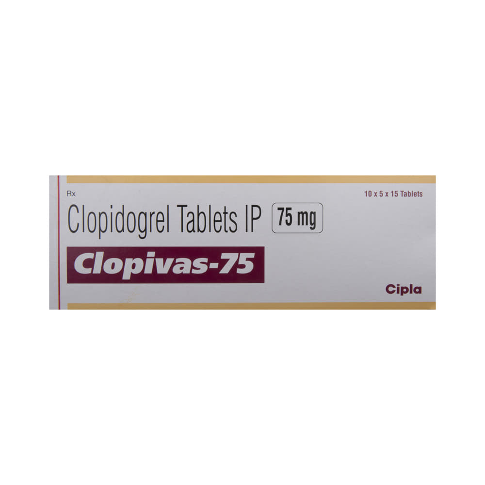 Clopivas 75 Tablet is an antiplatelet medicine or a blood thinner that helps to prevent the formation of harmful blood clots in your blood vessels. This helps to lower the chances of you getting a heart attack or stroke. It is a widely used medicine for heart protection. Clopivas 75 Tablet is prescribed to people at high risk of heart disease. This includes people with peripheral vascular disease (blood circulation problems due to narrowing of blood vessels), recent heart attack or stroke, irregular heartbeats, and those who have undergone certain heart procedures like stenting. It is also used in combination with some other medicines for the treatment of heart attack and some types of heart-related chest pain (unstable angina).This medicine may be taken with or without food and should be taken at the same time each day. It is important to keep taking this medicine even if you feel well. If you stop taking this medicine, it may increase your chance of having a heart attack or stroke.The most common side effect seen with this medicine is bleeding. This may be in the form of bruising, nose bleeds, blood in urine or stools (black-colored stools), or heavier periods than usual in women. If you cut or injure yourself, it may take longer than usual for the bleeding to stop. Such episodes of bleeding are usually mild and resolve on their own. However, you should consult your doctor straight away if the bleeding persists or worries you.This medicine is not suitable for some people. Do not take it if you are bleeding from anywhere in the body such as a stomach ulcer or bleeding within the brain. Before taking it, you should let your doctor know if you have ever had a problem with your blood not clotting properly or if you have recently had a serious injury or surgery. This medicine may need to be stopped temporarily before planned surgery or dental treatment.