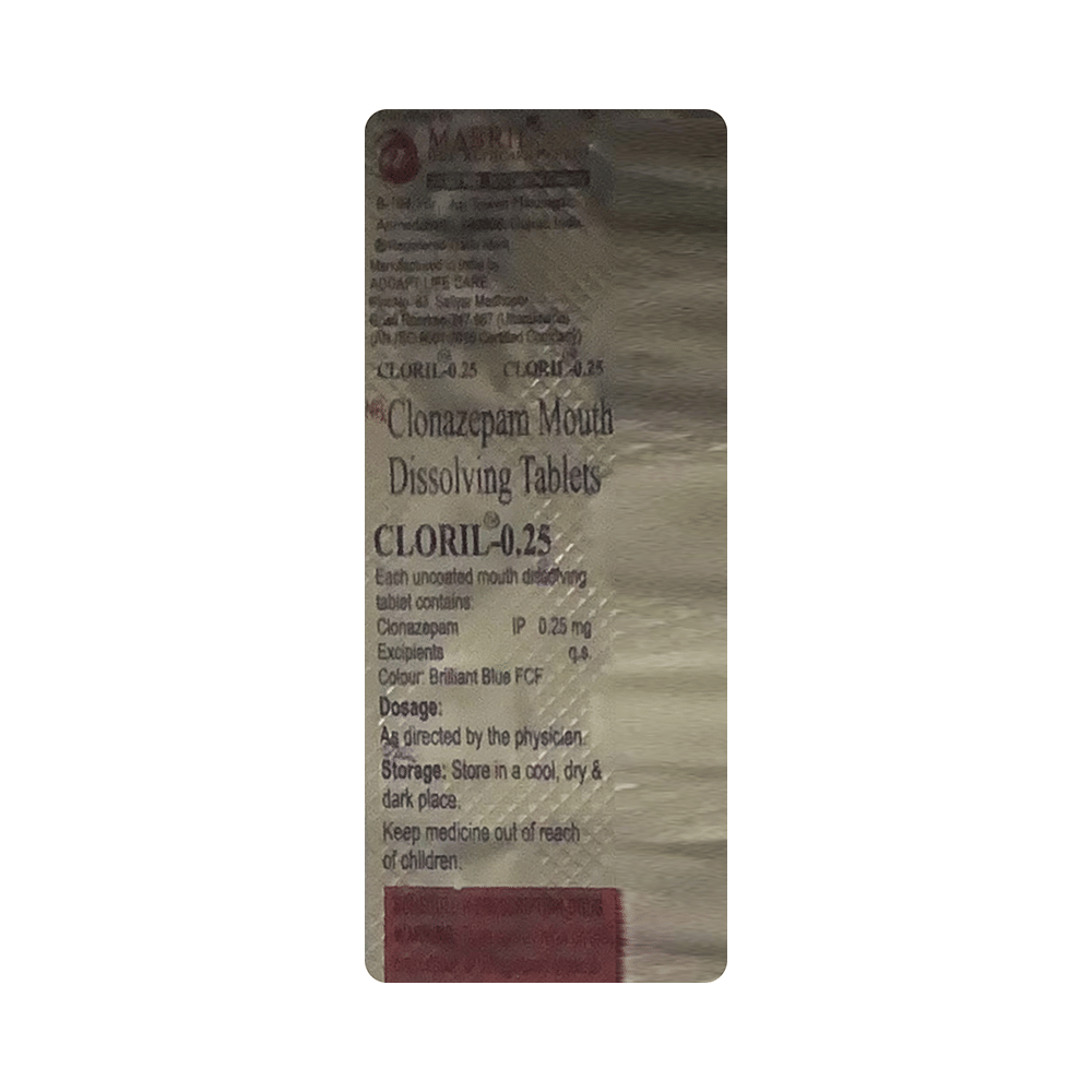 Cloril 0.25 Tablet MD is a prescription medicine used to treat epilepsy (seizures) and anxiety disorder. It helps to decrease the abnormal and excessive activity of the nerve cells and calms the brain. Cloril 0.25 Tablet MD may be taken with or without food. However, take it at the same time each day as this helps to maintain a consistent level of medicine in the body. Take this medicine in the dose and duration as advised by your doctor as it has a high potential of habit-forming. If you have missed a dose, take it as soon as you remember it and finish the full course of treatment even if you feel better. You should not stop this medicine suddenly without talking to your doctor as it may increase the seizure frequency and can cause nausea, anxiety, flu-like symptoms, and muscle pain.Some common side effects of this medicine include fatigue, depression and impaired coordination. It may also cause dizziness and sleepiness, so do not drive or do anything that requires mental focus until you know how this medicine affects you. It is important to inform your doctor if you develop any unusual changes in mood or depression as this medicine may cause suicidal thoughts.