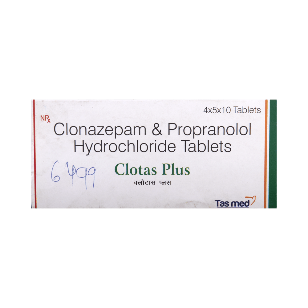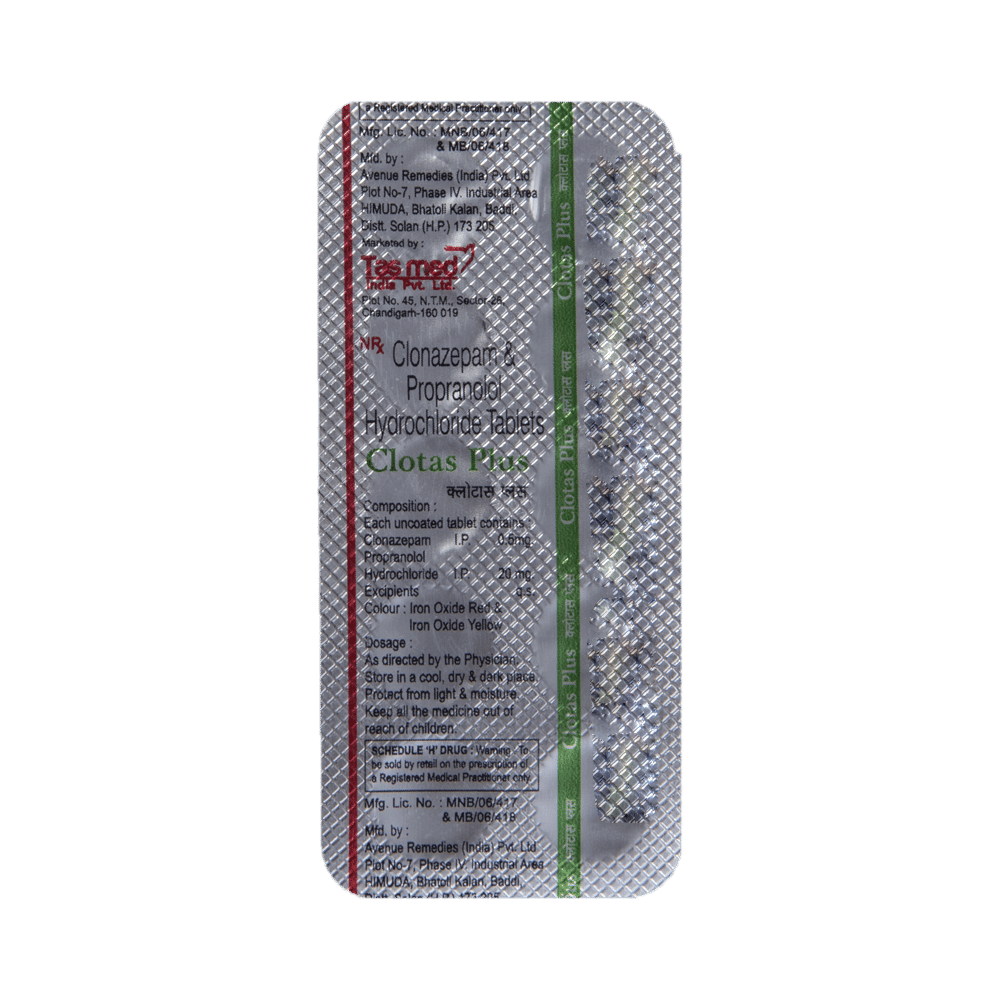 Clotas-Plus Tablet is a combination of two medicines: Clonazepam and Propranolol. Clonazepam is a benzodiazepine. It works by increasing the action of GABA, a chemical messenger which suppresses the abnormal and excessive activity of the nerve cells in brain. Propranolol is a beta blocker which blocks the action of certain chemical messengers on the heart and blood vessels. This reduces heart rate, blood pressure, and strain on the heart.