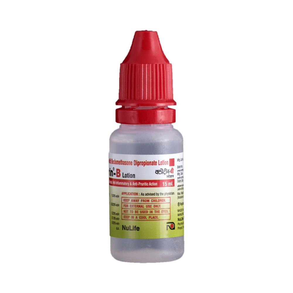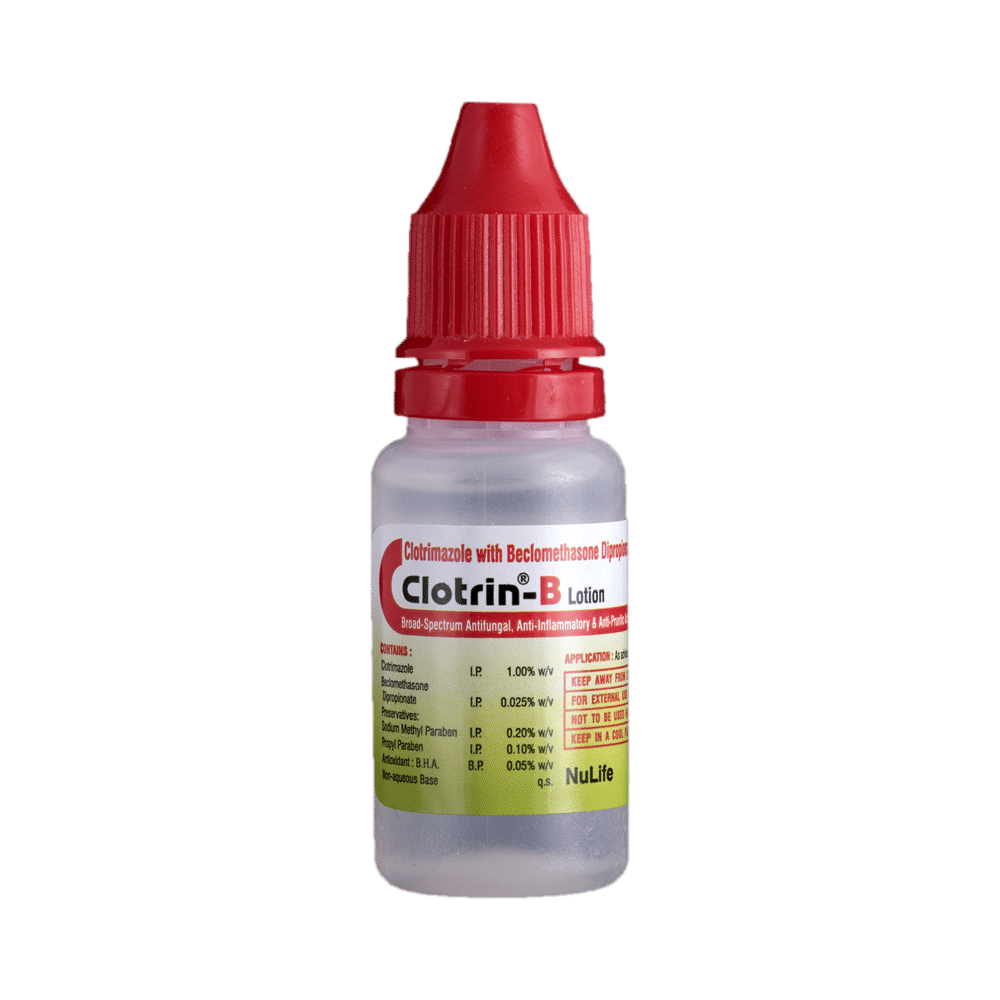 Clotrin-B Lotion is a combination medicine. It is used to treat various types of skin infections usually the fungal type of skin infections. It minimizes symptoms of inflammation such as redness, swelling, and itching. It also acts against the infection-causing microorganisms. Clotrin-B Lotion is only meant for external use and should be used as advised by your doctor. A thin layer of the medicine should be applied only to the affected areas of the skin with clean and dry hands. If it gets into your eyes, nose, mouth, or vagina rinse with water. It may take several days to weeks for your symptoms to improve, but you should keep using this medicine regularly. The course of the treatment should be completed to ensure better efficacy of the medicine. If your condition does not improve or gets worse, you should talk to your doctor.The most common side effect of this medicine includes dryness and paresthesia (tingling or pricking sensation). These are usually self-limiting. Serious side effects are rare. Consult your doctor if you experience any allergic reaction (rashes, itching, swelling, shortness of breath, etc.).Before taking this medicine, it is important to tell your doctor if you are taking or have recently taken any other medicines for the same disease or other diseases. Pregnant and breastfeeding women should take this medicine with proper consultation and caution.