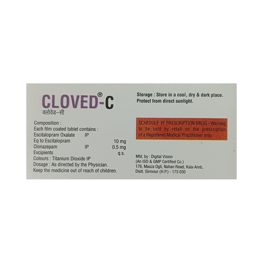 Cloved-C Tablet is a prescription medicine used to treat anxiety disorder. It is the combination medicine that calms the brain by decreasing the abnormal and excessive activity of the nerve cells. It also works by increasing the level of a chemical messenger in the brain which improves mood. Cloved-C Tablet can be taken with or without food. However, it is advised to take it at the same time each day as this helps to maintain a consistent level of medicine in the body. Take this medicine in the dose and duration advised by your doctor as it has habit-forming potential. If you miss a dose of this medicine, take it as soon as you remember. Finish the full course of treatment even if you feel better. It is important not to stop taking this medicine suddenly as it may cause withdrawal symptoms.Some common side effects of this medicine include delayed ejaculation, low sexual desire, vomiting, memory impairment, depression, and confusion. It may also cause dizziness and sleepiness. So, do not drive or do anything that requires mental focus until you know how this medicine affects you. It may cause weight gain or weight loss depending upon person to person. To prevent weight gain, you can eat a balanced diet and exercise regularly. On the other hand, weight loss can be prevented by increasing food portions in your diet. It is important to inform your doctor if you develop any unusual changes in mood as it can cause suicidal thoughts.Take caution while taking medicine if you are suffering from liver disease. Your doctor should also know about all other medicines you are taking as many of these may make this medicine less effective or change the way it works. Inform your doctor if you are pregnant, planning pregnancy or breastfeeding.