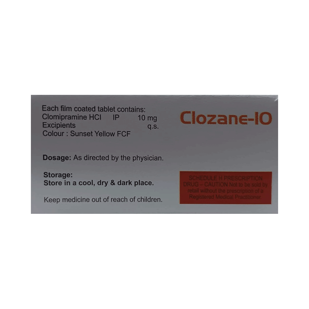 Clozane 10 Tablet is a medicine used in the treatment of obsessive compulsive disorders (OCD), phobic states (such as intense fears that interfere with daily life), and depression. It works by increasing the levels of serotonin, a natural chemical in the brain that affects mood and behavior. Take Clozane 10 Tablet exactly as prescribed by your doctor. The dose is usually started low and increased gradually to reduce side effects. It may take a few weeks before you notice the full benefits, so it is important not to stop taking it suddenly, even if you feel better. For best results, take the medicine at the same time every day and try not to miss any doses.Common side effects of Clozane 10 Tablet include dry mouth, constipation, dizziness, drowsiness, blurred vision, increased sweating, and changes in appetite or weight. These are often mild and may improve as your body gets used to the medicine. If you feel very drowsy, avoid driving or operating heavy machinery. If any of these side effects persist or worsen, inform your doctor promptly.Clozane 10 Tablet should be used with caution in people with heart disease, seizure disorders, glaucoma, or difficulty passing urine. This medicine can increase the risk of suicidal thoughts in some people, especially young adults; therefore, close monitoring at the start of treatment is important.Clozane 10 Tablet should not be taken together with medicines called monoamine oxidase inhibitors (MAOIs), or within two weeks of stopping them, due to the risk of serious reactions. Alcohol should be avoided as it can worsen drowsiness and other side effects. Pregnant and breastfeeding women should consult their doctors before taking this medicine to make sure it is safe.