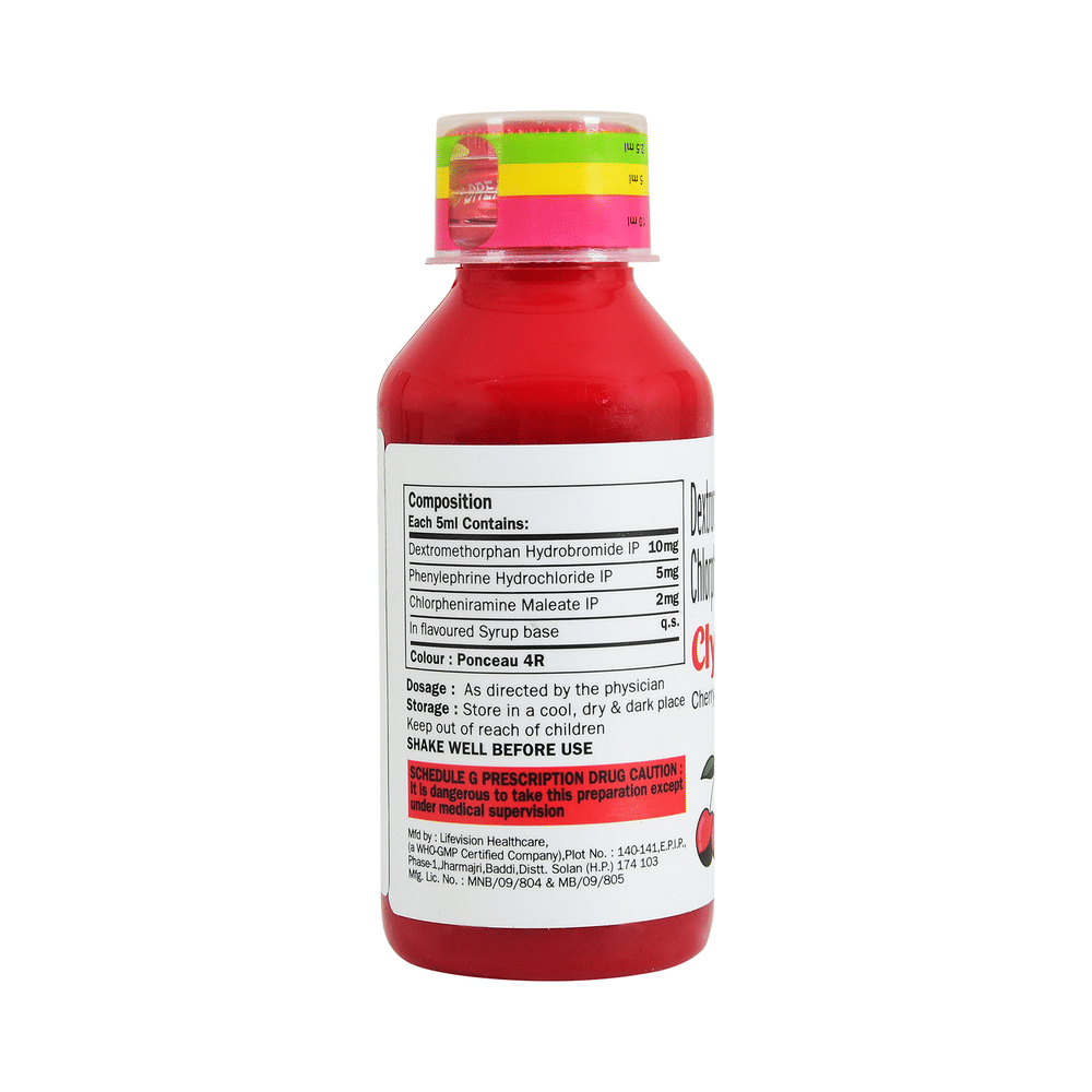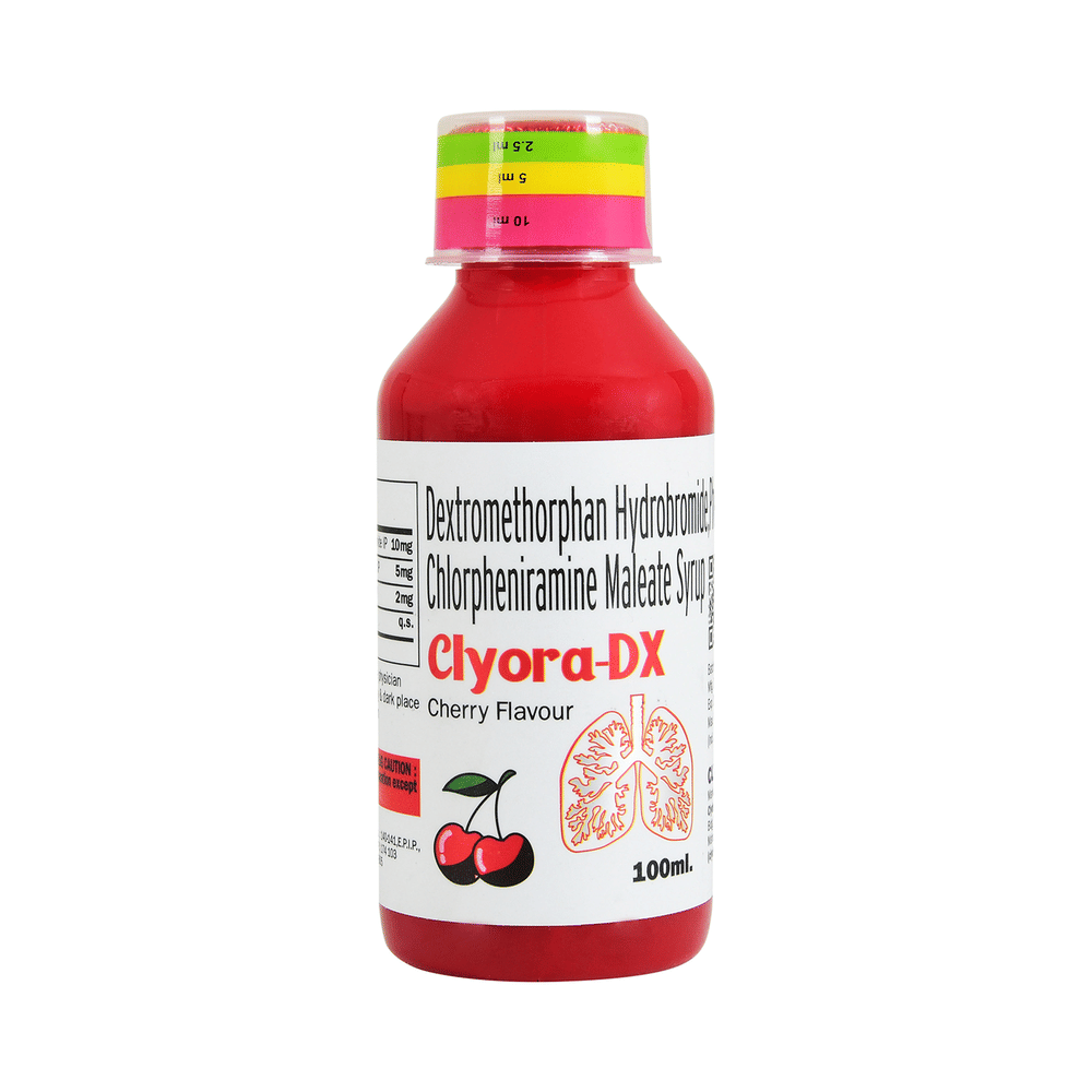 Clyora-DX Syrup Cherry is a medicine used in the treatment of common cold and cough. It can provide quick relief from cough and common cold symptoms like runny nose, stuffy nose, sneezing, watery eyes, and congestion or stuffiness. Clyora-DX Syrup Cherry is taken with or without food in a dose and duration as advised by the doctor. The dose you are given will depend on your condition and how you respond to the medicine. You should keep taking this medicine for as long as your doctor recommends. If you stop treatment too early your symptoms may come back and your condition may worsen. Let your healthcare team know about all other medications you are taking as some may affect, or be affected by this medicine.Common side effects of this medicine include headache, sedation, double vision, vomiting, diarrhea, dry mouth, and nausea. Most of these are temporary and usually resolve with time. Contact your doctor straight away if you are at all concerned about any of these side effects. This medicine can also cause sleepiness, so do not drive or do anything that requires mental focus until you know how this medicine affects you. Avoid drinking alcohol while taking this medicine as it can worsen your sleepiness.Never support self-medication or recommend your medicine to another person. It is beneficial to have plenty of fluids while taking this medication. Before taking this medicine, you should tell your doctor if you are pregnant, planning pregnancy or breastfeeding. You should also tell your doctor if you have any kidney or liver diseases so that your doctor can prescribe a suitable dose for you.