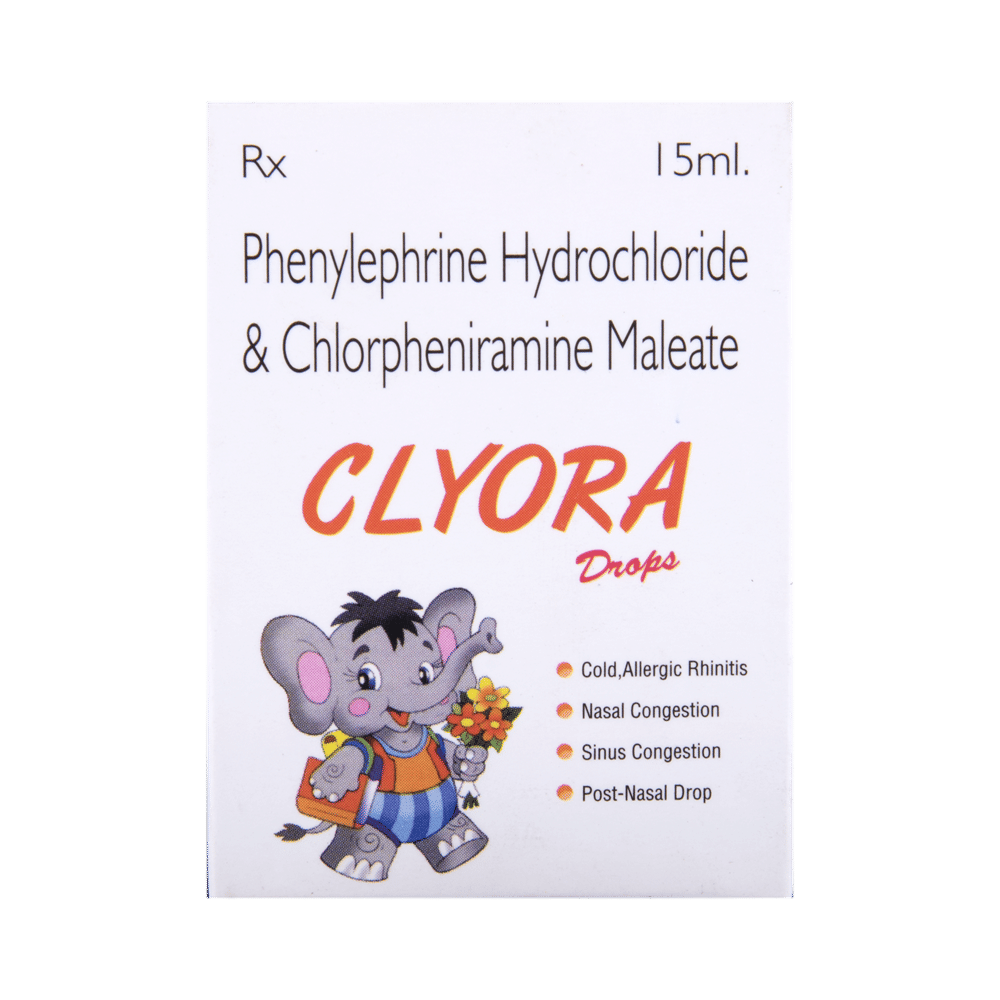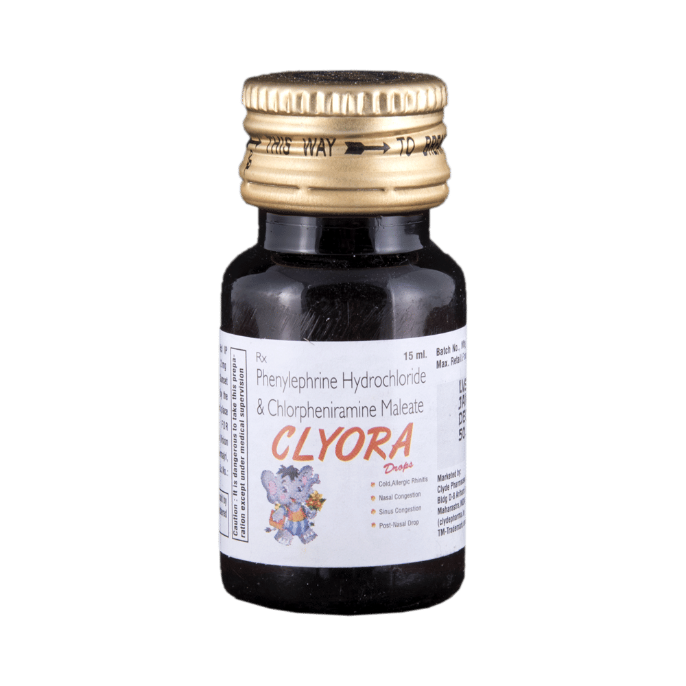 Clyora Oral Drops is a combination medicine used for the symptomatic treatment of common cold in children. It helps relieve discomfort caused by a runny nose, blocked nose, and sneezing, allowing the child to breathe more easily and feel better. Clyora Oral Drops may be given to your child with or without food. Always follow the exact dose and duration prescribed by the doctor. The dosage will depend on your child’s age, weight, and the severity of symptoms. Do not stop the medicine early, even if your child seems to be feeling better, unless advised by the doctor.Common side effects may include nausea, vomiting, or headache. These are usually mild and temporary. However, if you notice anything unusual or are concerned about how your child is responding to the medicine, consult your doctor promptly. This medicine may also cause drowsiness, so avoid engaging your child in activities that require alertness until you know how it affects them.Make sure your child stays well hydrated while taking Clyora Oral Drops. Inform your doctor if your child has any history of liver or kidney problems, as the dose may need to be adjusted accordingly.Note: As per the Ministry of Health and Family Welfare, Clyora Oral Drops should not be used in children below 4 years of age.