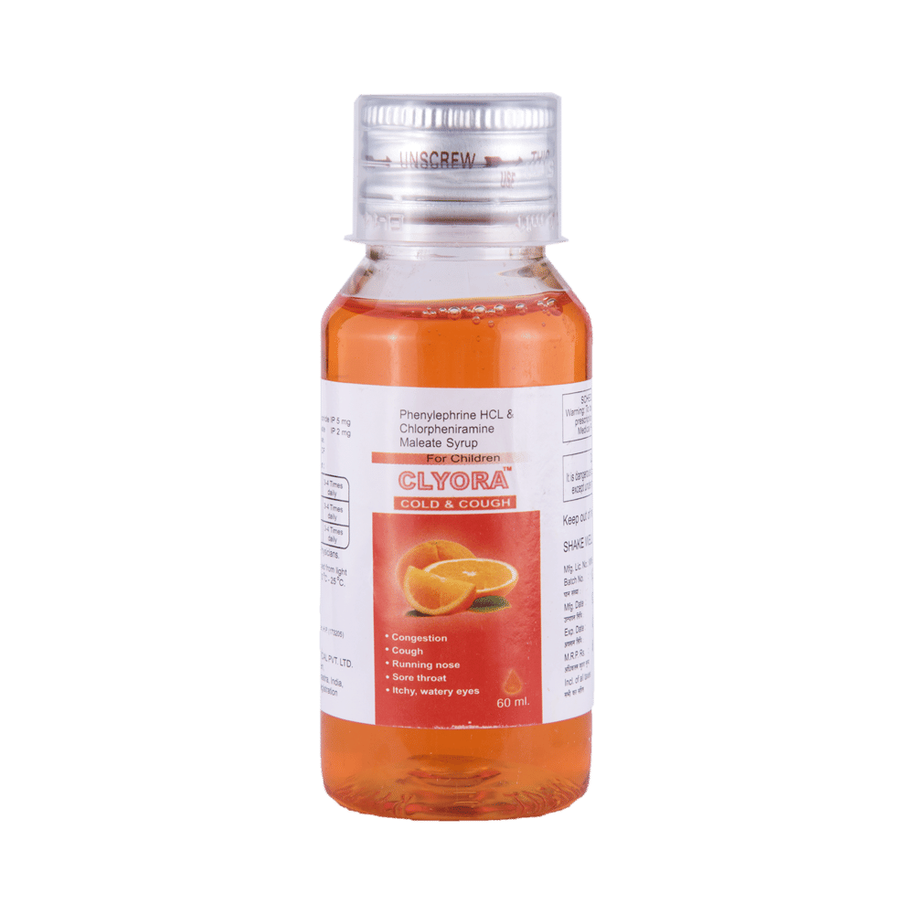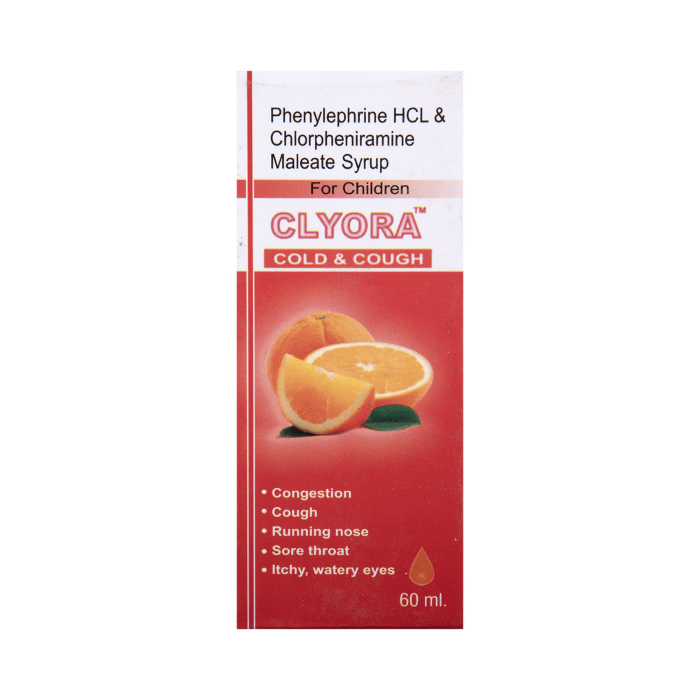 Clyora Syrup is a combination medicine used for the symptomatic treatment of common cold in children. It helps relieve discomfort caused by a runny nose, blocked nose, and sneezing, allowing the child to breathe more easily and feel better. Clyora Syrup may be given to your child with or without food. Always follow the exact dose and duration prescribed by the doctor. The dosage will depend on your child’s age, weight, and the severity of symptoms. Do not stop the medicine early, even if your child seems to be feeling better, unless advised by the doctor.Common side effects may include nausea, vomiting, or headache. These are usually mild and temporary. However, if you notice anything unusual or are concerned about how your child is responding to the medicine, consult your doctor promptly. This medicine may also cause drowsiness, so avoid engaging your child in activities that require alertness until you know how it affects them.Make sure your child stays well hydrated while taking Clyora Syrup. Inform your doctor if your child has any history of liver or kidney problems, as the dose may need to be adjusted accordingly.Note: As per the Ministry of Health and Family Welfare, Clyora Syrup should not be used in children below 4 years of age.