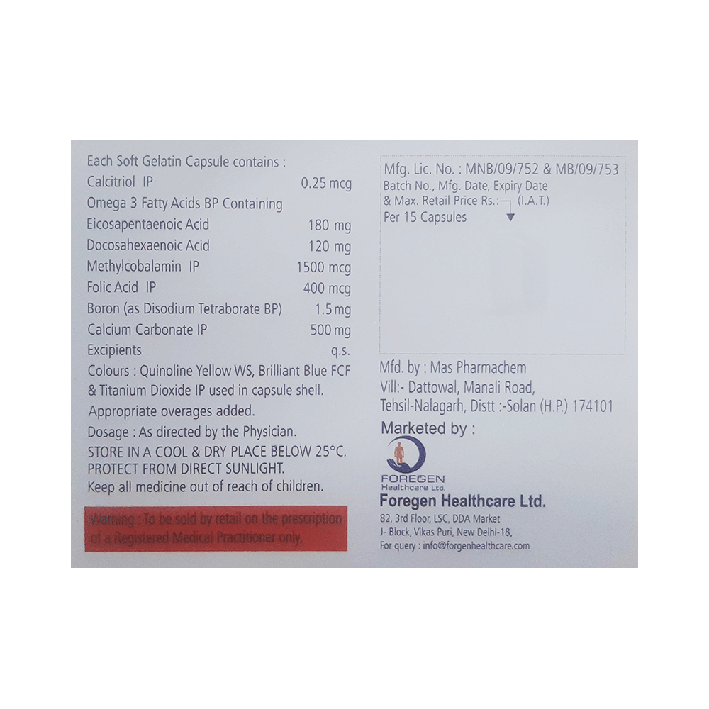 Salt Composition: Eicosapentaenoic Acid (180mg) + Docosahexanoic acid(DHA) (120mg) + Methylcobalamin (1500mcg) + Calcitriol (0.25mcg) + Calcium Carbonate (500mg) + Boron (1.5mg) + Folic Acid (400mcg)