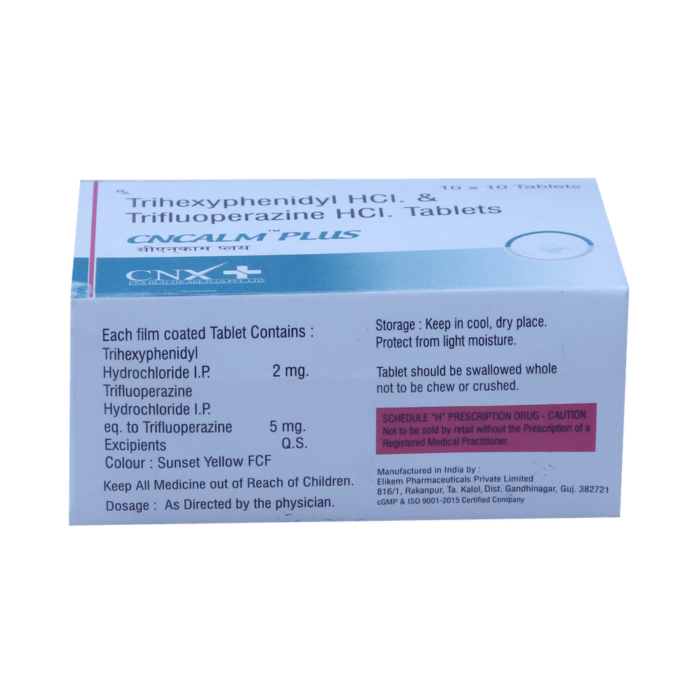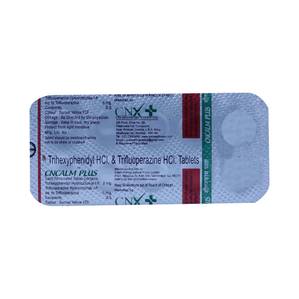Cncalm Plus 5mg/2mg Tablet is a combination of two medicines: Trifluoperazine and Trihexyphenidyl. Trifluoperazine is a typical antipsychotic. It works by blocking the action of a chemical messenger (dopamine) in the brain that affects thoughts and mood. However, it may cause side effects such as involuntary movements (shaking of hands, muscle spasms). Trihexyphenidyl is added to treat and prevent these side effects.