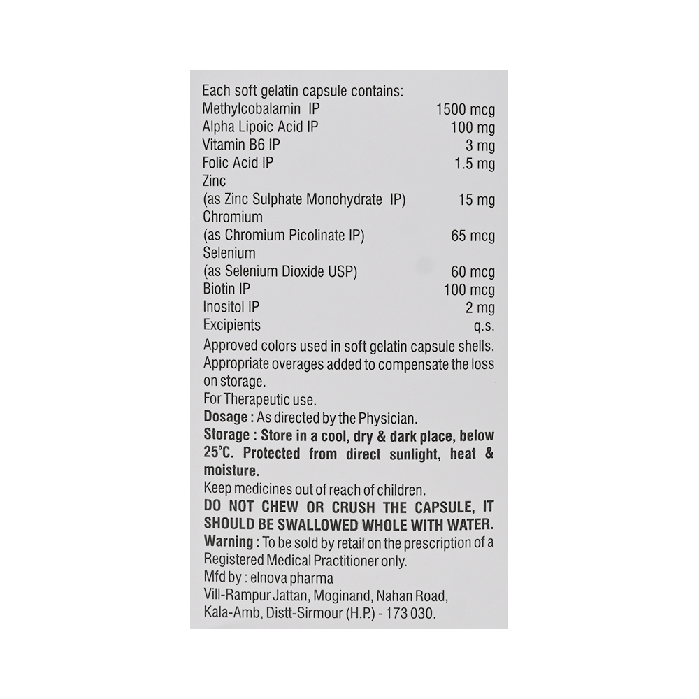 Salt Composition: Methylcobalamin (1500mcg) + Alpha Lipoic Acid (100mg) + Biotin (100mcg) + Selenium dioxide (60mcg) + Chromium Picolinate (65mcg) + Zinc Sulphate Monohydrate (15mg) + Vitamin B6 (Pyridoxine) (3mg) + Inositol (2mg) + Folic Acid (1.5mg)