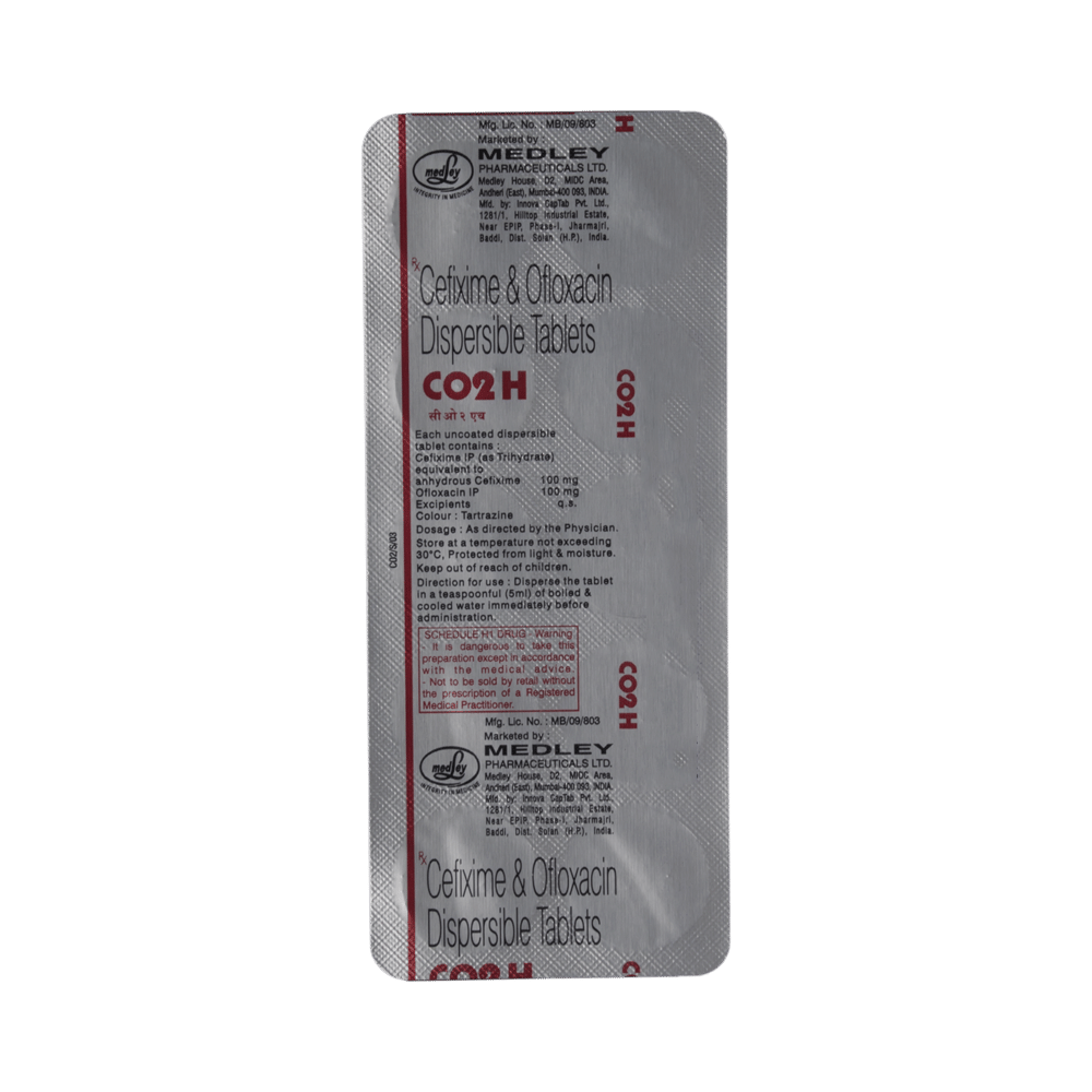 CO2 H Tablet DT contains two antibiotics. Cefixime works by preventing the formation of the bacterial protective covering (cell wall) while ofloxacin directly interacts with the genetic material of bacteria. As a consequence, the infection-causing bacteria stop growing further and the spread of the infection is successfully arrested.