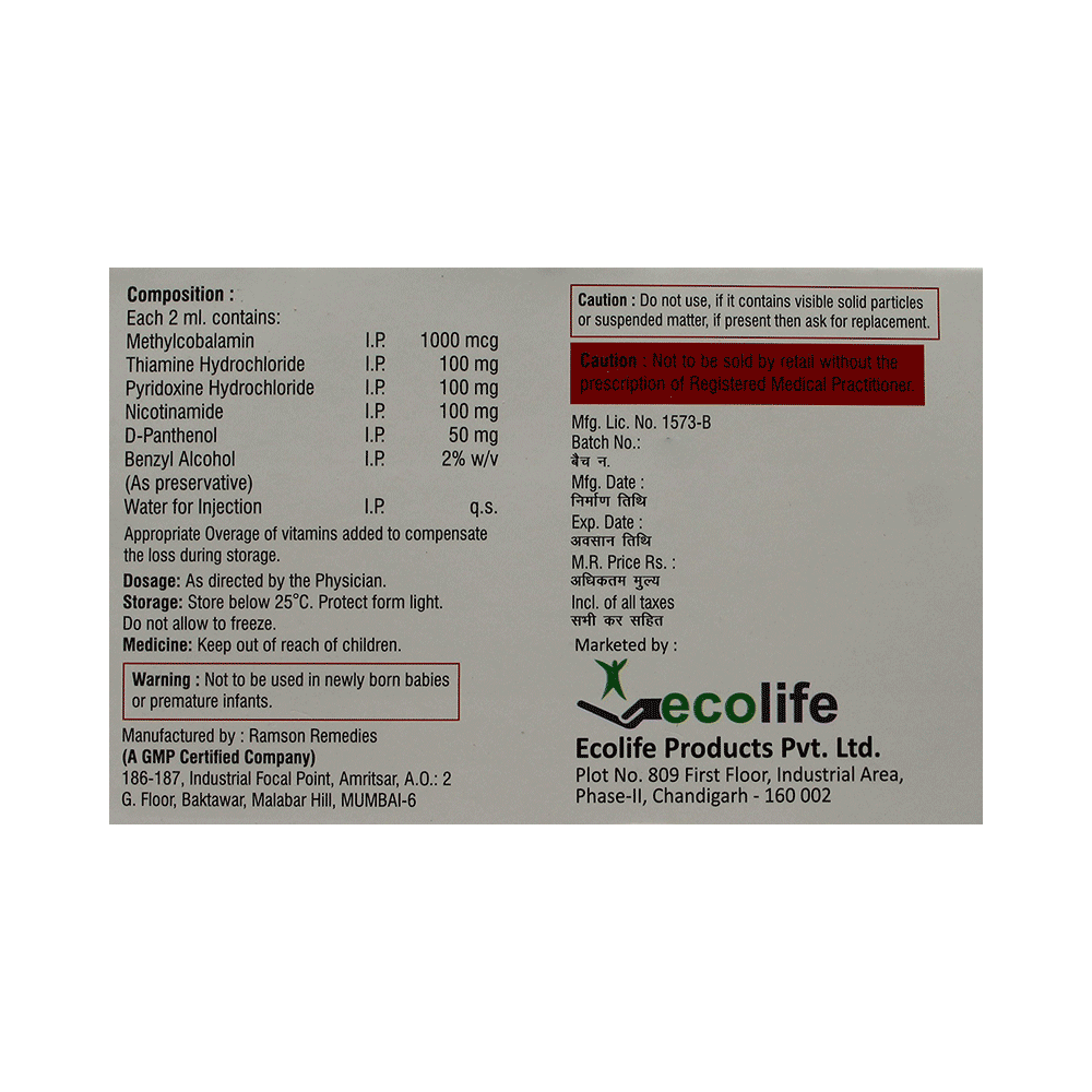 Salt Composition: Methylcobalamin (1000mcg) + Thiamine(Vitamin B1) (100mg) + Vitamin B6 (Pyridoxine) (100mg) + Nicotinamide (100mg) + D-Panthenol (50mg)