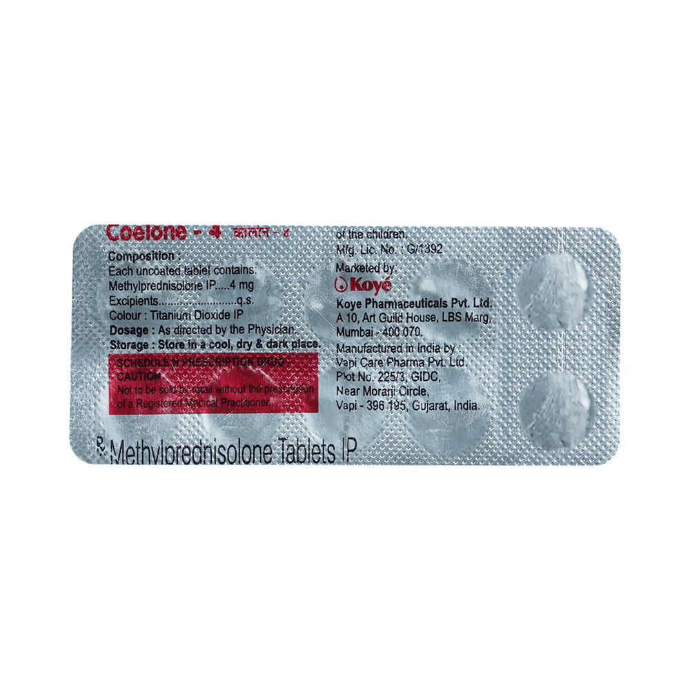 In Treatment of Allergic conditionsCoelone 4mg Tablet is used to treat different inflammatory and allergic conditions including arthritis, lupus, psoriasis, ulcerative colitis which affect the skin, blood, eyes, lungs, stomach, and nervous system. It works by lowering your immune system’s response to these conditions thereby reducing symptoms such as swelling, pain, itching and other allergic-type reactions.This medicine is given orally (by mouth). You should always take it as it has been prescribed for you. Do not stop taking it without your doctor’s advice. This can cause unpleasant withdrawal symptoms. Because this medicine weakens your immune system, you should avoid being near people who are ill or have infections.In Treatment of Systemic lupus erythematosus (SLE)Systemic lupus erythematosus (SLE) is an autoimmune disease. In this disease, the immune system of the body mistakenly attacks healthy tissue. It can affect the skin, joints, kidneys, brain, and other organs. Coelone 4mg Tablet prevents the release of substances in the body that cause inflammation. It lowers your immune system’s response and reduces symptoms such as swelling, pain, itching and other allergic-type reactions.In Treatment of Skin disordersCoelone 4mg Tablet prevents the release of substances in the body that cause inflammation. It can be used to treat different inflammatory and allergic conditions of the skin such as eczema and psoriasis. It works by lowering your immune system’s response to these conditions thereby relieving symptoms such as swelling, pain, itching and other allergic-type reactions.In Treatment of Eye disordersCoelone 4mg Tablet helps relieve symptoms of eye infections such as redness, swelling, itching and watering of eyes. This medicine works by decreasing the production of certain chemicals that cause inflammation of the eyes. This will make it easier for you to go about your daily activities. Use it as prescribed to get the most benefit. If you see no improvement even after a week, talk to your doctor.In Treatment of Rheumatic disorderRheumatic disorder is an autoimmune condition where your body’s immune system (which usually fights bacteria and viruses) attacks your body’s own cells. Coelone 4mg Tablet stops that from happening and can relieve the symptoms of this condition such as pain, swelling, and stiffness in your joints. It can also slow down joint damage, reduce disability, and enable you to be as active for as long as possible. It can take several weeks or months to notice the effect of the medicine. You should continue taking it until your doctor says it is okay to stop using the medicine.show moreshow less