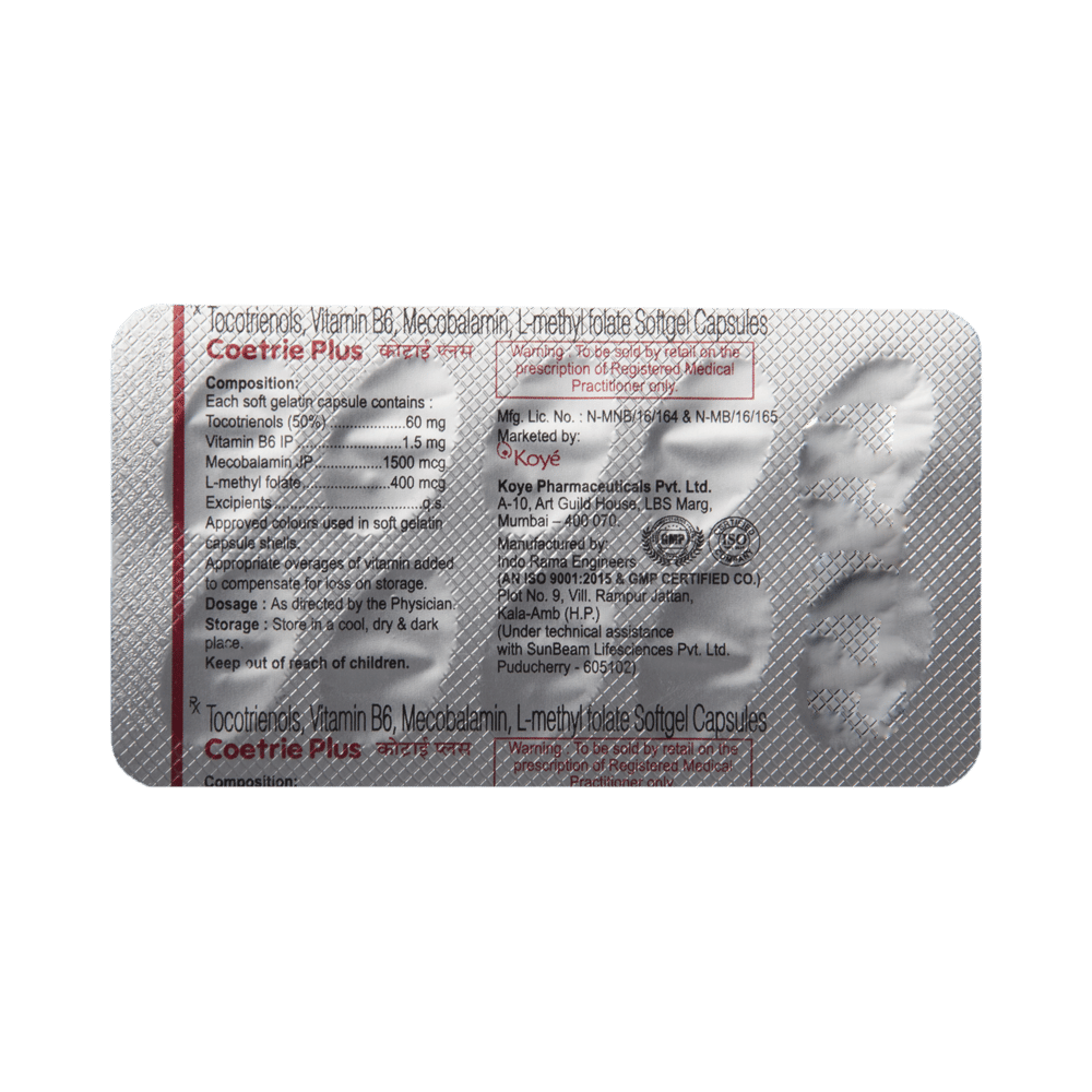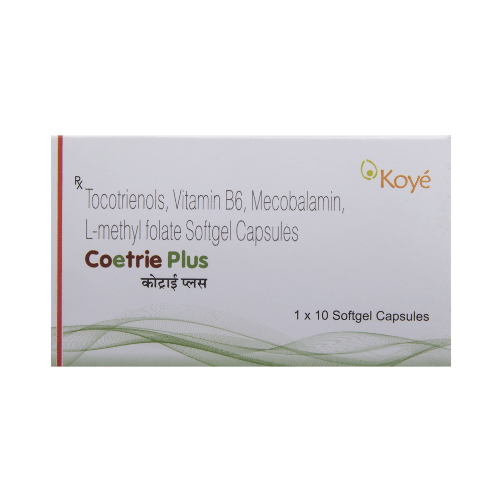 Coetrie Plus Capsule is a multivitamin product. L-Methyl folate (a form of folic acid) is essential for DNA synthesis, cell division, and the formation of red blood cells. Methylcobalamin is a form of vitamin B12 that is crucial for nerve health, DNA synthesis, and red blood cell production. Pyridoxine treats and prevents the deficiency of vitamin B6 and improves the functioning of the nervous and immune systems. Vitamin E is a potent antioxidant that helps protect cells from oxidative damage caused by free radicals. It supports the immune system and may play a role in skin health and protection against certain chronic diseases.