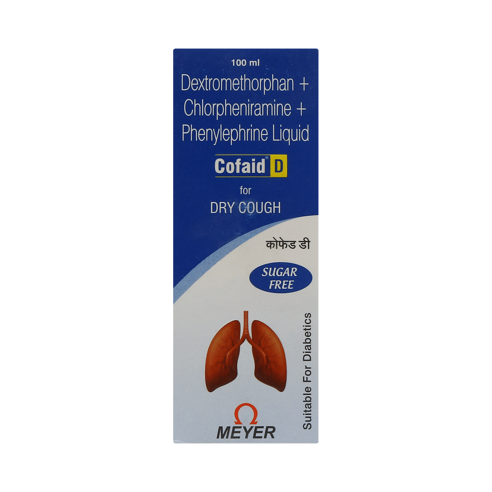 Cofaid D Syrup Sugar Free is a combination of three medicines: Phenylephrine, Chlorpheniramine Maleate, and Dextromethorphan Hydrobromide. Phenylephrine is a decongestant which narrows the small blood vessels providing relief from congestion or stuffiness in the nose. Chlorpheniramine Maleate is an antiallergic which relieves allergy symptoms like runny nose, watery eyes and sneezing. Dextromethorphan Hydrobromide is a cough suppressant which relieves cough by reducing the activity of cough center in the brain.