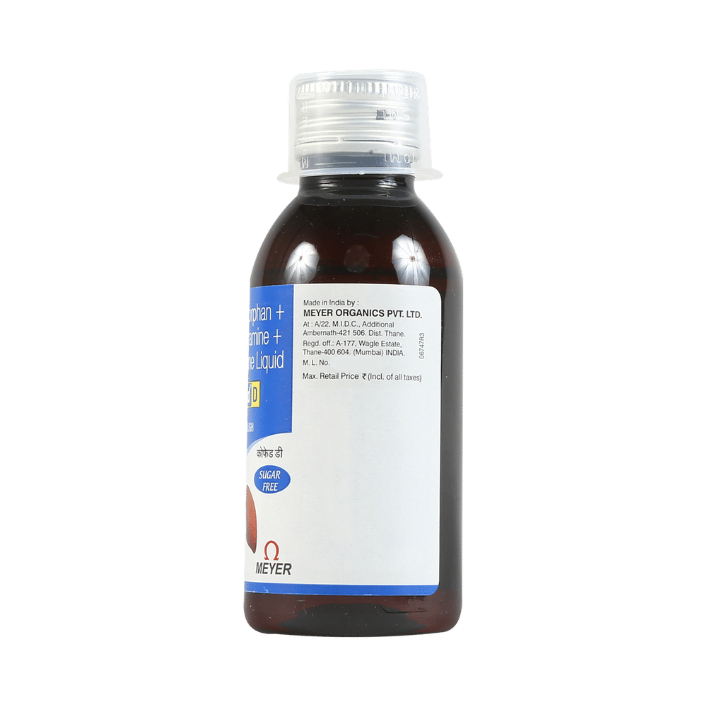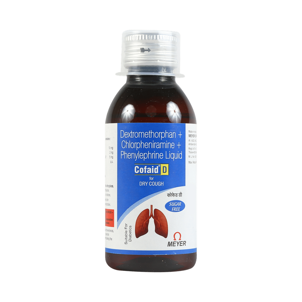 Cofaid D Syrup Sugar Free is a medicine used in the treatment of common cold and cough. It can provide quick relief from cough and common cold symptoms like runny nose, stuffy nose, sneezing, watery eyes, and congestion or stuffiness. Cofaid D Syrup Sugar Free is taken with or without food in a dose and duration as advised by the doctor. The dose you are given will depend on your condition and how you respond to the medicine. You should keep taking this medicine for as long as your doctor recommends. If you stop treatment too early your symptoms may come back and your condition may worsen. Let your healthcare team know about all other medications you are taking as some may affect, or be affected by this medicine.Common side effects of this medicine include headache, sedation, double vision, vomiting, diarrhea, dry mouth, and nausea. Most of these are temporary and usually resolve with time. Contact your doctor straight away if you are at all concerned about any of these side effects. This medicine can also cause sleepiness, so do not drive or do anything that requires mental focus until you know how this medicine affects you. Avoid drinking alcohol while taking this medicine as it can worsen your sleepiness.Never support self-medication or recommend your medicine to another person. It is beneficial to have plenty of fluids while taking this medication. Before taking this medicine, you should tell your doctor if you are pregnant, planning pregnancy or breastfeeding. You should also tell your doctor if you have any kidney or liver diseases so that your doctor can prescribe a suitable dose for you.
