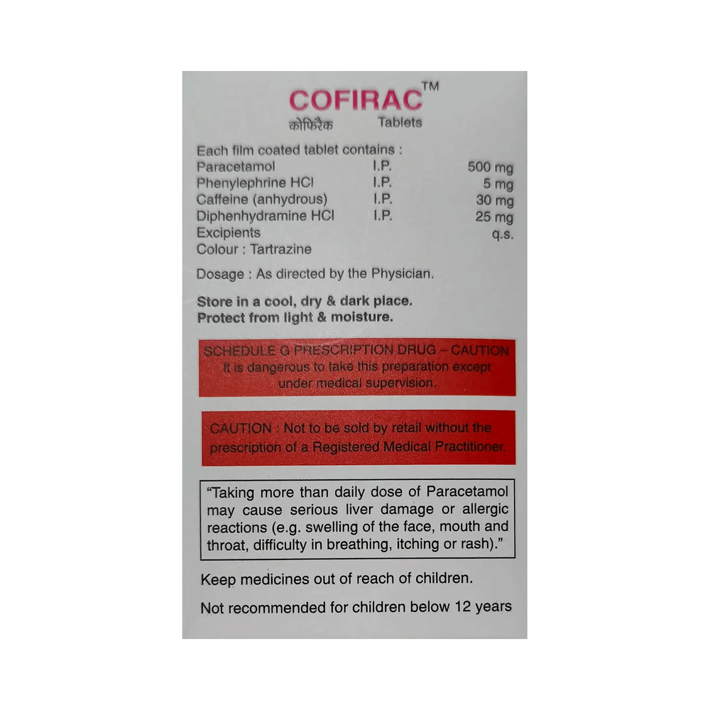 Cofirac Tablet is used to treat common cold symptoms. It provides temporary relief from stuffiness in the nose. It also helps relieve allergy symptoms like a runny nose and watery eyes. Cofirac Tablet is taken with or without food in a dose and duration as advised by the doctor. It is better to take it with food to avoid stomach upset. The dose you are given will depend on your condition and how you respond to the medicine. You should keep taking this medicine for as long as your doctor recommends. If you stop treatment too early, your symptoms may come back, and your condition may worsen. Let your doctor know about all other medications you are taking, as some may affect or be affected by this medicine.The most common side effects are nausea, vomiting, stomach pain, insomnia, restlessness, impaired coordination, and headache. Most of these are temporary and usually resolve with time. Contact your doctor straight away if you are at all concerned about any of these side effects. It can also cause dizziness and sleepiness, so do not drive or do anything that requires mental focus until you know how this medicine affects you. Avoid drinking alcohol while taking this medicine, as it can make dizziness worse.Before taking it, you should tell your doctor if you have any kidney or liver diseases so that your doctor can prescribe a suitable dose for you. Also, tell your doctor if you are pregnant, planning pregnancy, or breastfeeding.