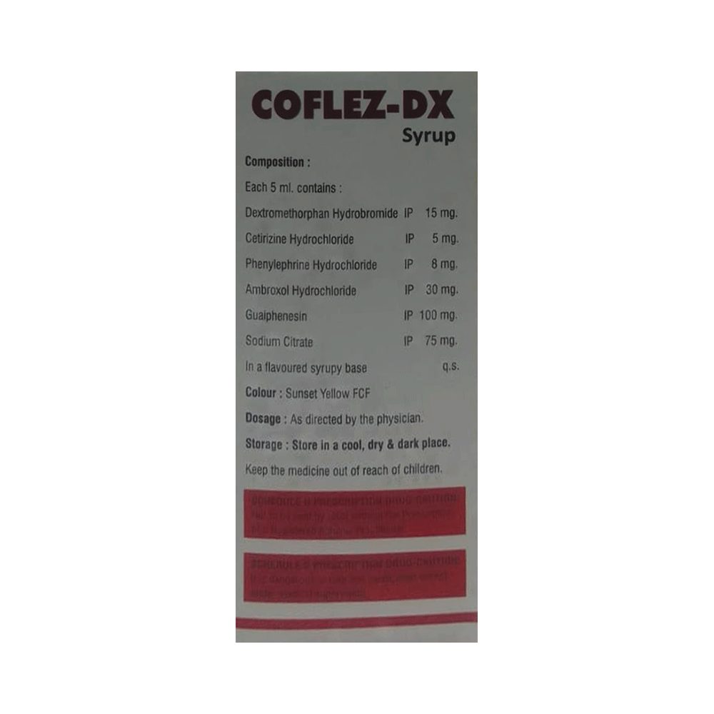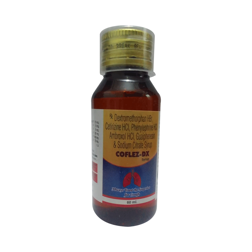 Coflez-DX Syrup is a combination medicine used to treat dry cough. It narrows the small blood vessels and relieves congestion or stuffiness in the nose. It also reduces allergy symptoms like watery eyes, sneezing, runny nose, and throat irritation. Coflez-DX Syrup may be taken with or without food in a dose and duration as the doctor advises. Your dose will depend on your condition and how you respond to the medicine. You should keep taking this medicine for as long as your doctor recommends. If you stop treatment too early, your symptoms may come back, and your condition may worsen. Let your doctor know about all other medications you are taking, as some may affect or be affected by this medicine.Common side effects of this medication include sedation (sleepiness), dry mouth, nausea, vomiting, dizziness, gastrointestinal discomfort, and headache. Most of these are temporary and usually resolve with time. Let your doctor know if you are concerned about these side effects. This medicine can also cause dizziness and sleepiness, so do not drive or do anything that requires mental focus until you know how this medicine affects you. Avoid drinking alcohol while taking this medicine, as it can make dizziness worse.Never support self-medication or recommend your medicine to another person. Keep it out of reach of children. It is beneficial to have plenty of fluids while taking this medication. Before taking it, you should tell your doctor if you have any kidney or liver diseases so that your doctor can prescribe a suitable dose for you. Pregnant or breastfeeding women should also consult their doctor before taking this medicine.