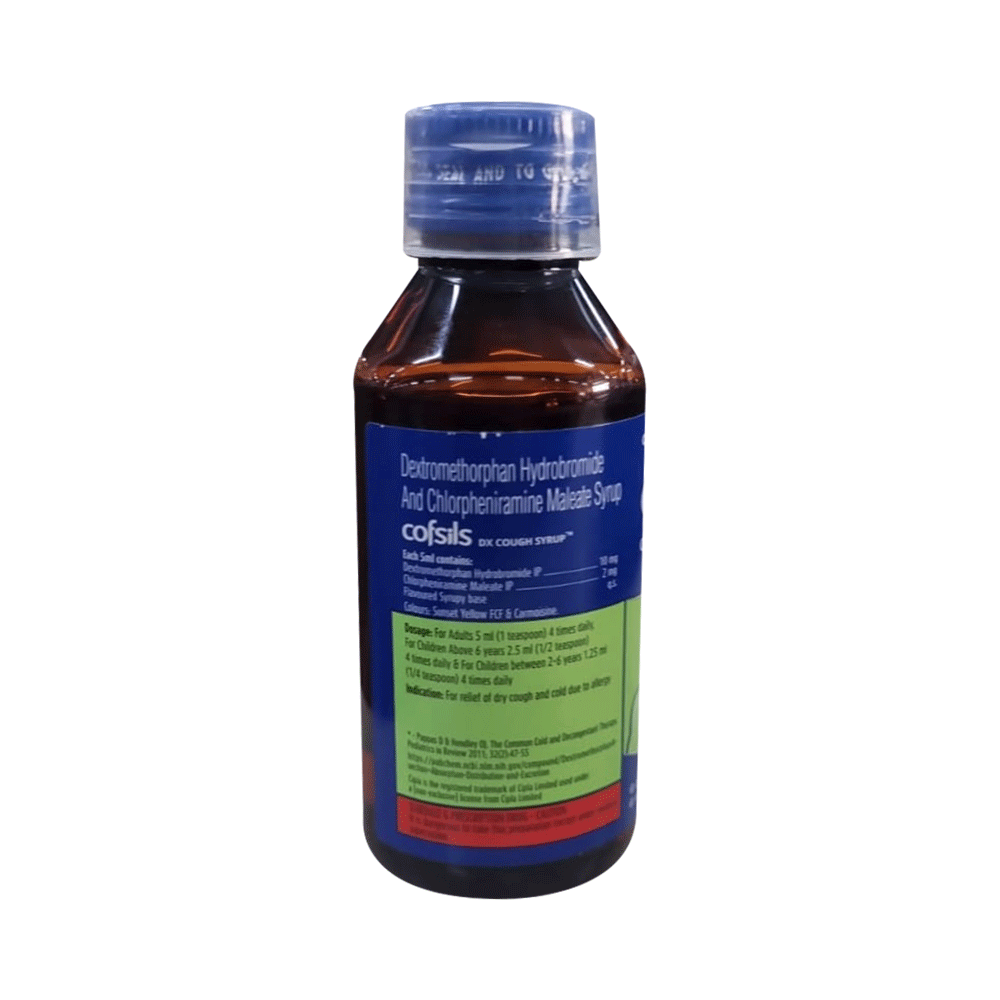 Cofsils DX Syrup is a combination of two medicines: Chlorpheniramine Maleate and Dextromethorphan Hydrobromide, which relieves dry cough. Chlorpheniramine Maleate is an antiallergic which helps reduce cough associated with allergies by blocking the effects of a chemical messenger, histamine. Dextromethorphan Hydrobromide is a cough suppressant which relieves cough by reducing the activity of cough center in the brain.