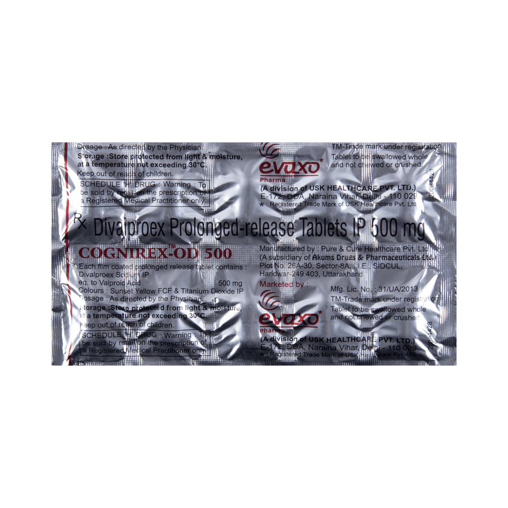 In Treatment of Bipolar disorderCognirex-OD 500 Tablet PR works to restore the normal balance of nerve activity in your brain. It can help prevent extreme changes in mood and help you feel less agitated. You may experience fewer episodes of low mood. It can take several weeks for this medicine to work and you may still feel low during this time. It is likely that you will take this medicine for at least six months but possibly much longer. It needs to be taken regularly to work effectively. Do not stop taking it unless your doctor advises you to. You should continue to eat well and keep fit to reduce symptoms of bipolar disorder.In Treatment of Epilepsy/SeizuresCognirex-OD 500 Tablet PR is an anticonvulsant (or anti-epileptic) medicine that works by decreasing the nerve impulses which cause the seizures. By controlling the frequency of seizures, it will help you go about your daily activities with more confidence. It helps reduce symptoms such as confusion, uncontrollable jerking movements, loss of awareness, and fear or anxiety.This medicine is not associated with any physical or psychological dependence (addiction) but it should not be stopped suddenly. It must be taken regularly as prescribed to be effective. Missing doses may trigger a seizure.show moreshow less