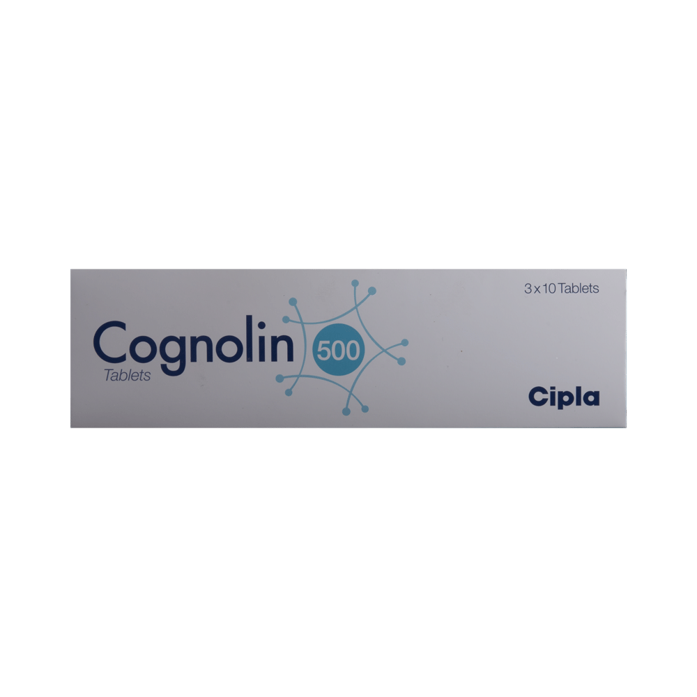 Cognolin 500 Tablet helps in the treatment of stroke, head injury, Alzheimer's disease, and memory loss (dementia) in Parkinson's disease. It protects the nerve cells in the brain from damage and also helps to repair the damaged nerve cells. Cognolin 500 Tablet may be taken with or without food. However, it is advised to take it at the same time each day as this helps to maintain a consistent level of medicine in the body. Your dose depends on your age and the condition you are being treated for. Take this medicine in the dose and duration as advised by your doctor. Do not stop taking it suddenly without talking to your doctor as it may worsen your symptoms.Some common side effects that may be seen with this medicine include decreased blood pressure, stomach pain, diarrhea, irregular heart rate, rash, insomnia, occurrence or intensification of numbness of paralyzed extremities. However, these are temporary and usually resolve on their own. Please consult your doctor if these do not subside or bother you.Before taking this medicine, inform your doctor if you ever had any problems with your kidneys or if you have or ever had any seizures (epilepsy or fits). Always let your doctor know about all the medicines that you are taking before you start with your treatment. Inform your doctor if you are pregnant, planning to conceive or breastfeeding, before using this medicine.