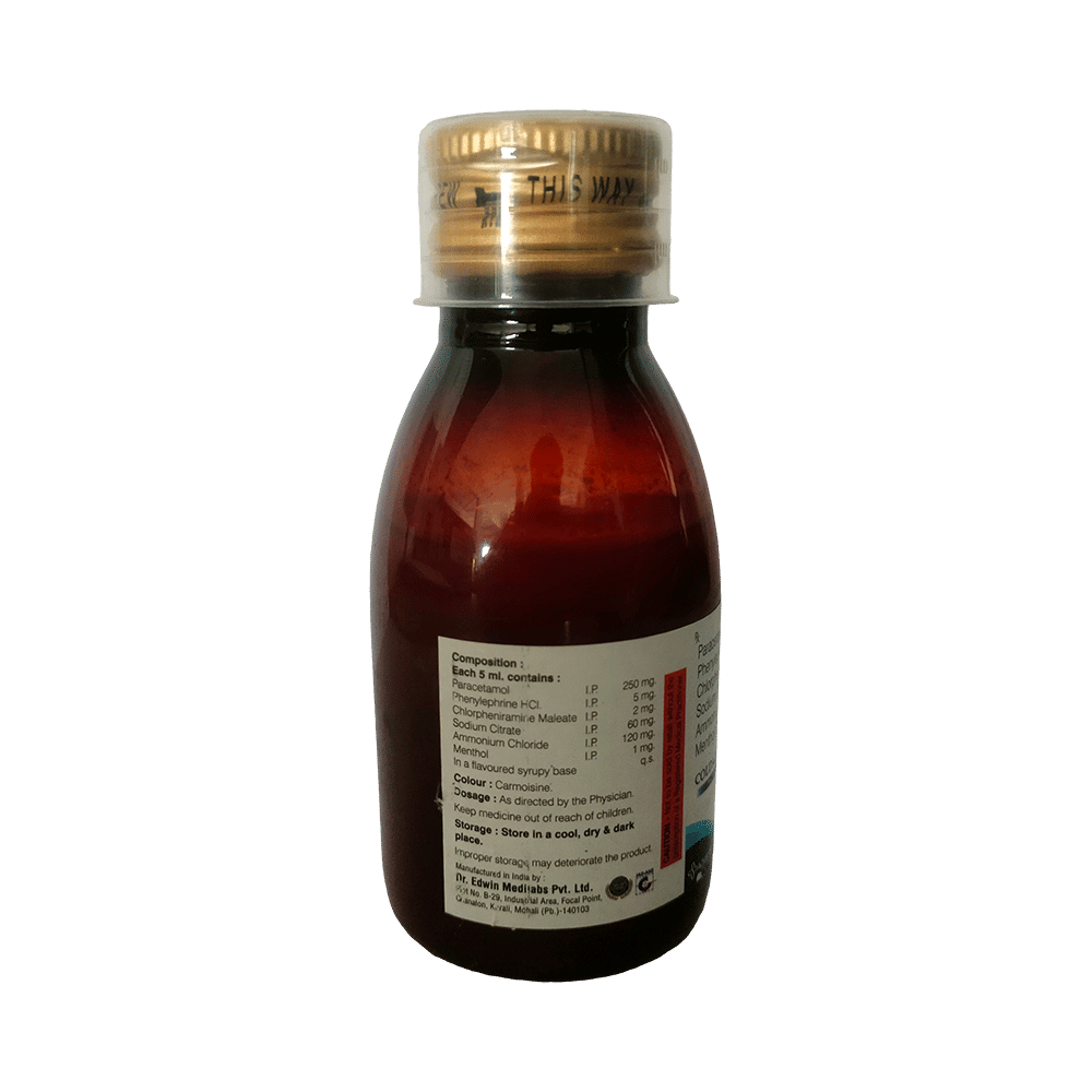 Salt Composition: Paracetamol (250mg/5ml) + Chlorpheniramine Maleate (2mg/5ml) + Phenylephrine (5mg/5ml) + Sodium Citrate (60mg/5ml) + Ammonium Chloride (120mg/5ml) + Menthol (1mg/5ml)