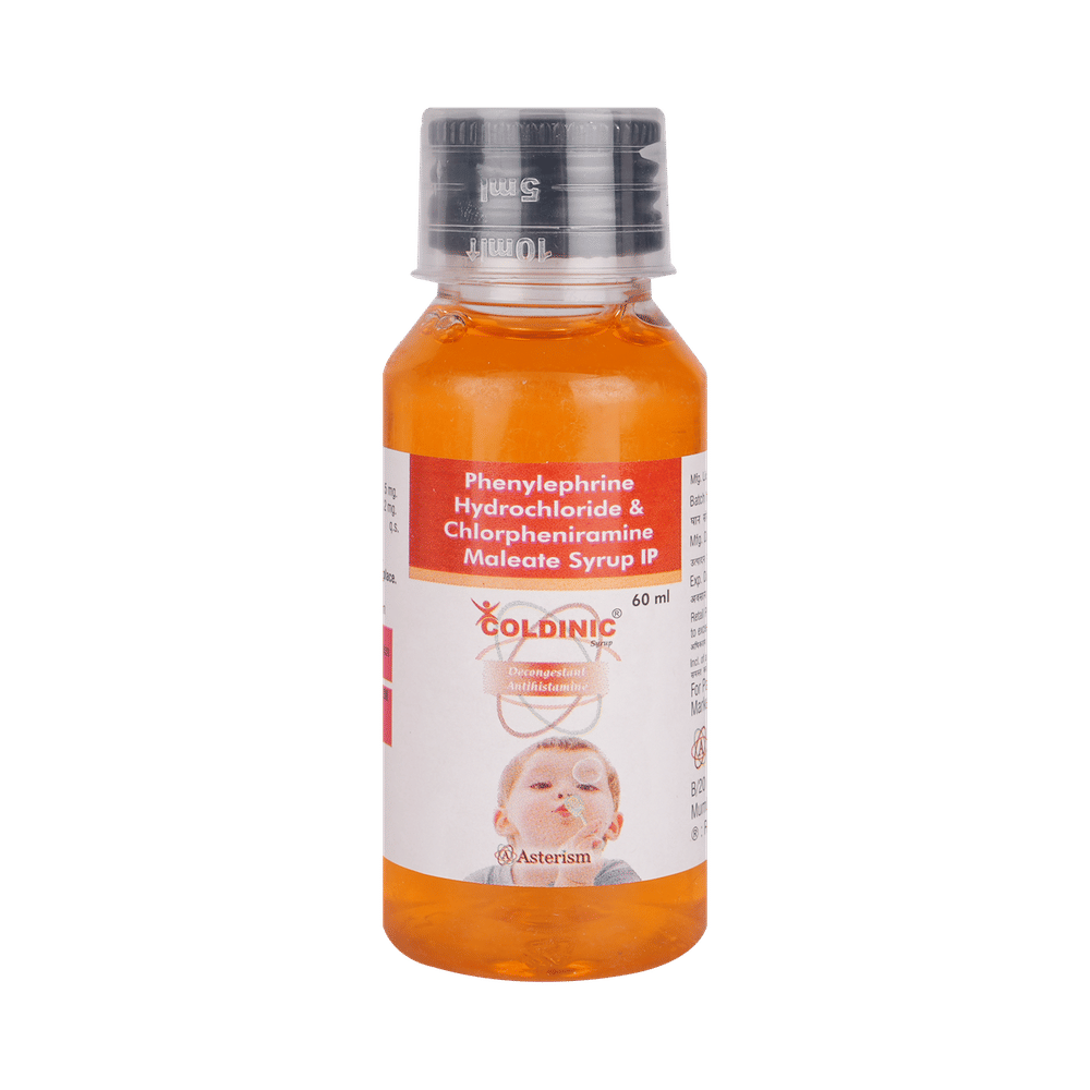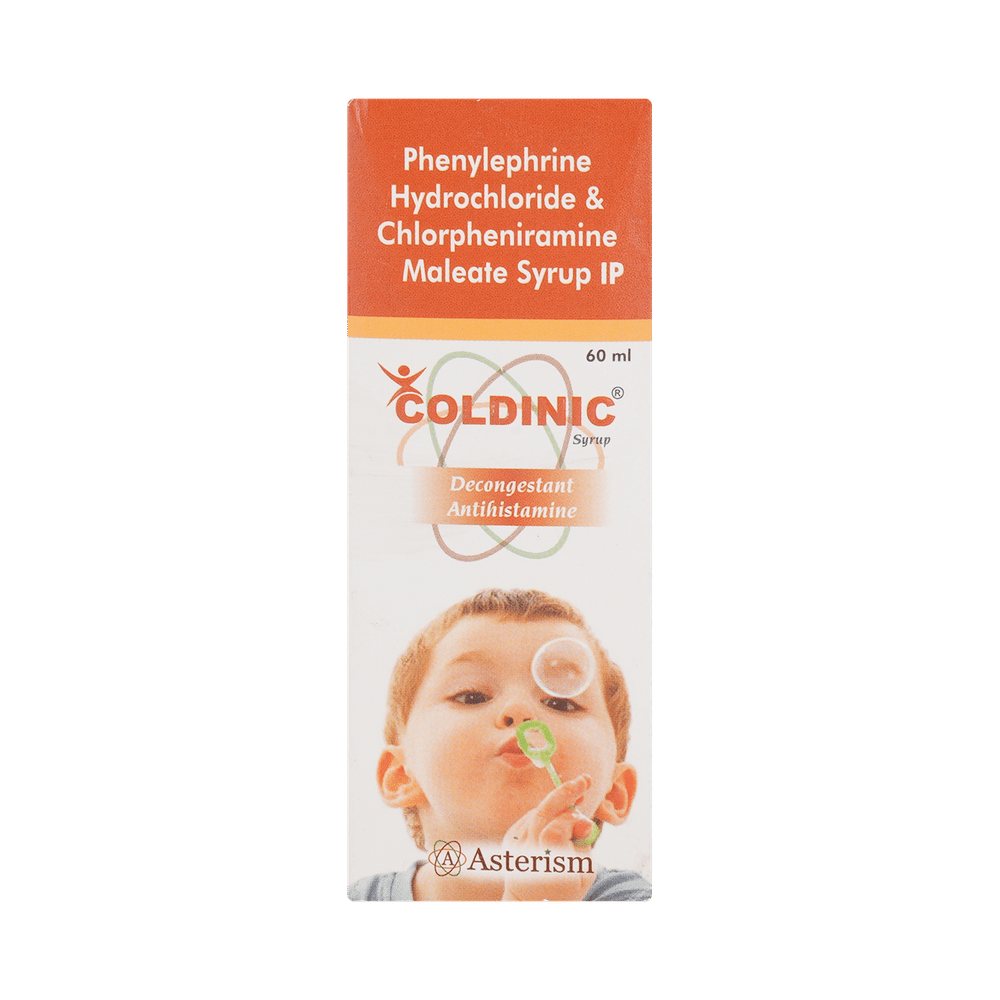 Coldinic Syrup is a combination medicine used for the symptomatic treatment of common cold in children. It helps relieve discomfort caused by a runny nose, blocked nose, and sneezing, allowing the child to breathe more easily and feel better. Coldinic Syrup may be given to your child with or without food. Always follow the exact dose and duration prescribed by the doctor. The dosage will depend on your child’s age, weight, and the severity of symptoms. Do not stop the medicine early, even if your child seems to be feeling better, unless advised by the doctor.Common side effects may include nausea, vomiting, or headache. These are usually mild and temporary. However, if you notice anything unusual or are concerned about how your child is responding to the medicine, consult your doctor promptly. This medicine may also cause drowsiness, so avoid engaging your child in activities that require alertness until you know how it affects them.Make sure your child stays well hydrated while taking Coldinic Syrup. Inform your doctor if your child has any history of liver or kidney problems, as the dose may need to be adjusted accordingly.Note: As per the Ministry of Health and Family Welfare, Coldinic Syrup should not be used in children below 4 years of age.