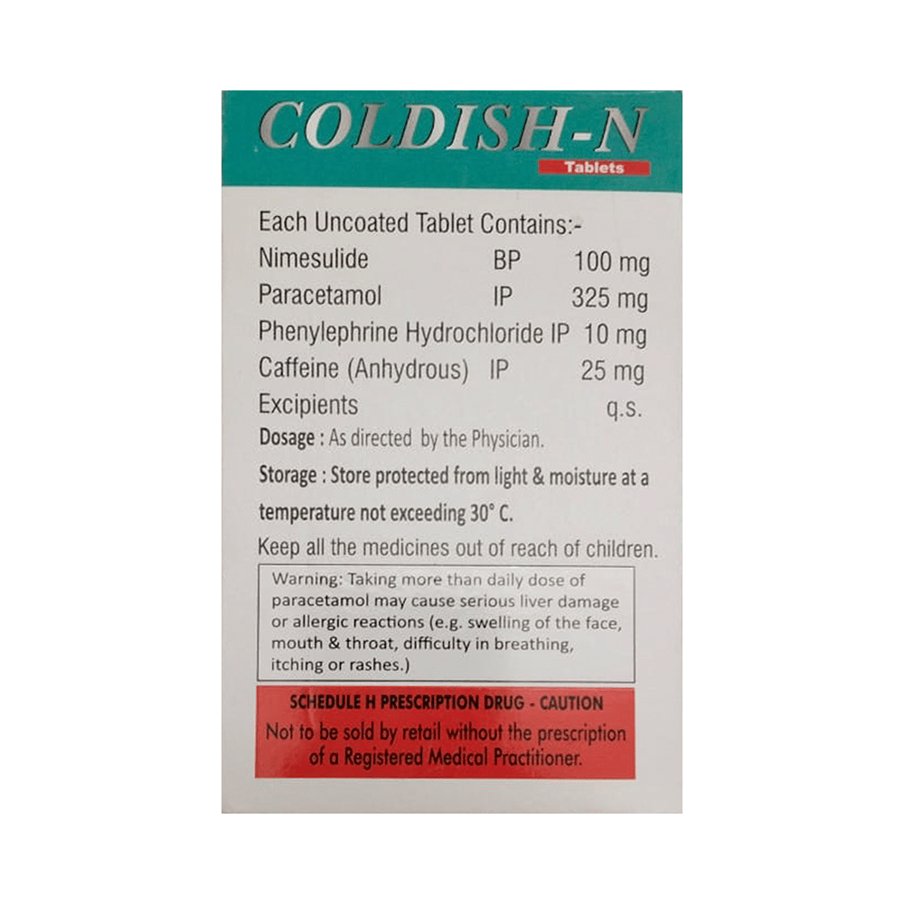 Coldish-N Tablet is a medicine used to treat common cold symptoms. It provides relief from allergic symptoms like runny nose, sneezing, watery eyes, and nasal congestion. It also blocks the release of certain chemical that cause pain and inflammation and relieves aches and fever associated with cold. Coldish-N Tablet may be taken with or without food. Take it regularly and at the same time each day to get maximum benefits from it. Do not take this medicine more than the recommended dose, a high dose, or overdose may have harmful effects on the body. Prolong use of this medicine may harm your health, do not take it more than the prescribed duration unless your doctor advised you to do so.It may cause side effects like nausea, vomiting, dry mouth, and diarrhea in some patients. Let your doctor know if any of these side effects bother you. Inform your doctor immediately if any rash or allergic reaction is observed while taking this medicine. Before taking it, tell your doctor if you are pregnant, breastfeeding, or taking any other medicines.Note: As per the Ministry of Health and Family Welfare, Coldish-N Tablet is banned for children under 12 years of age.