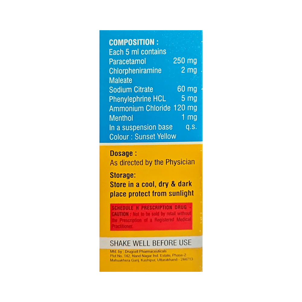 Salt Composition: Paracetamol (250mg/5ml) + Chlorpheniramine Maleate (2mg/5ml) + Phenylephrine (5mg/5ml) + Sodium Citrate (60mg/5ml) + Ammonium Chloride (120mg/5ml) + Menthol (1mg/5ml)